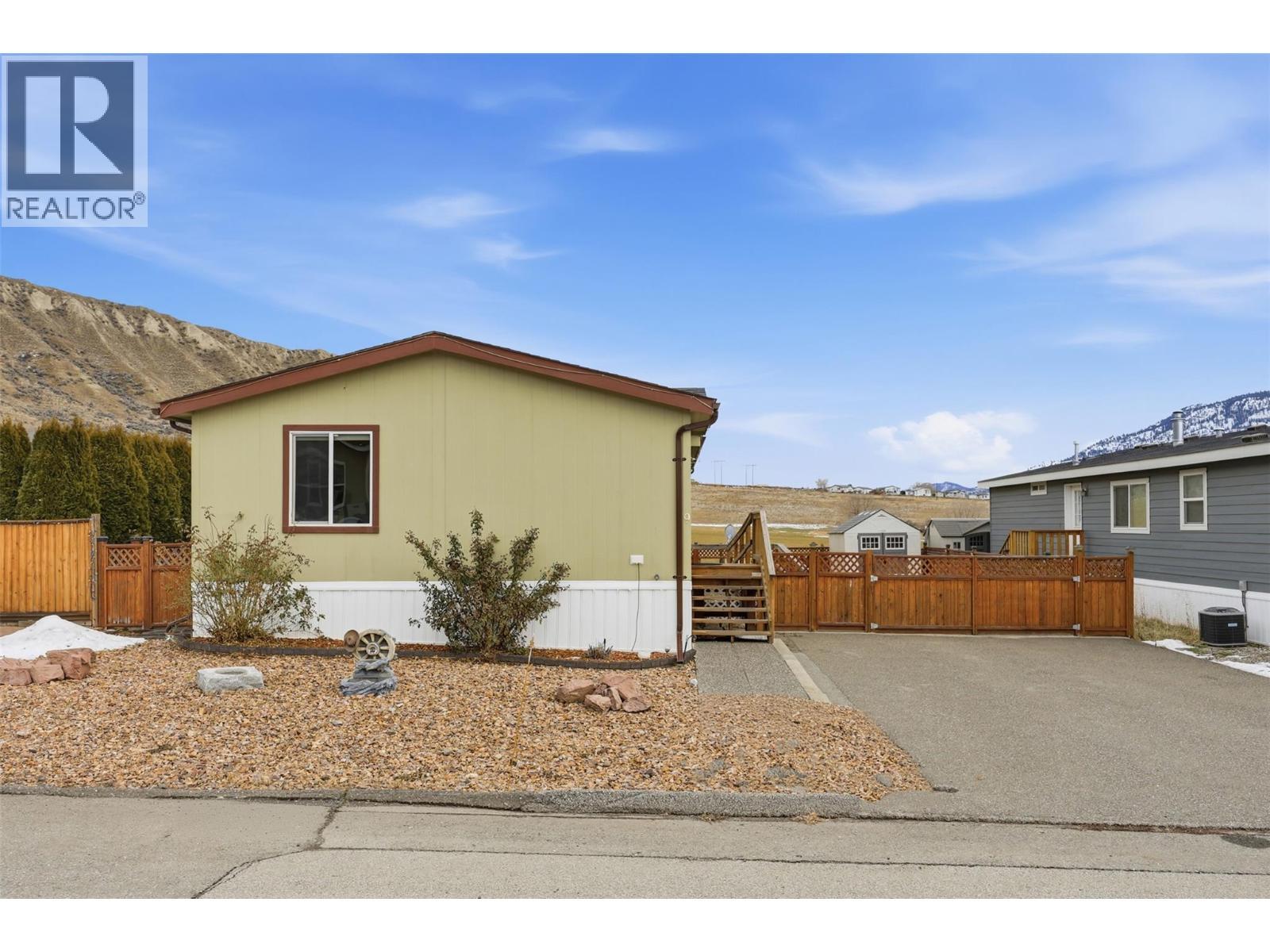 This 3 Bedroom & 2 Bathroom home features 1,056 sq ft of living space, an open-concept & bright floor plan with vaulted ceilings, boasting a spacious kitchen w/pantry, gas range and SS appliances, a dining area and a living room with large windows. Located in South Bend Estates just 8 minutes from Downtown Kamloops and 15 minutes from Thompson Rivers University. The layout is ideal with the 2 secondary bedrooms & 1 bathroom at one end of the home with the primary bedroom and a 4pc ensuite being at the other end. This home is equipped with a ramp for anyone needing mobility / wheelchair access! Enjoy beautiful views in every direction, a fenced yard with raised garden boxes and a private patio space - perfect for entertaining and or for a future hot-tub! Other features include a new hot water tank (2025), 2 large sheds, central air-conditioning, Hardie Board siding, good storage throughout the home and plenty of parking with RV & Boat parking available in the complex. Truly a must-see! Perfect for anyone downsizing, first-time buyers, or a family looking for a great home with a good sized yard. Low pad rent of $450 per month, includes water, septic and garbage. Dogs and cats are allowed - see bylaws! (id:6769)