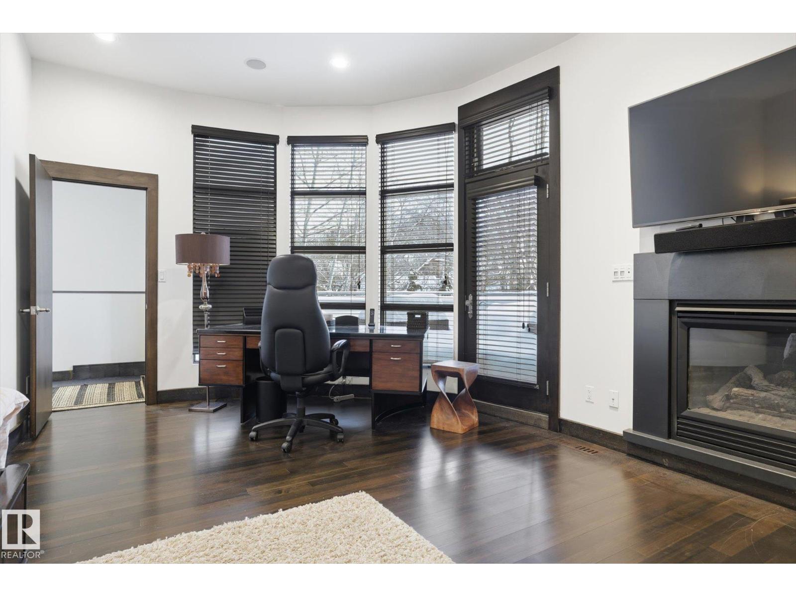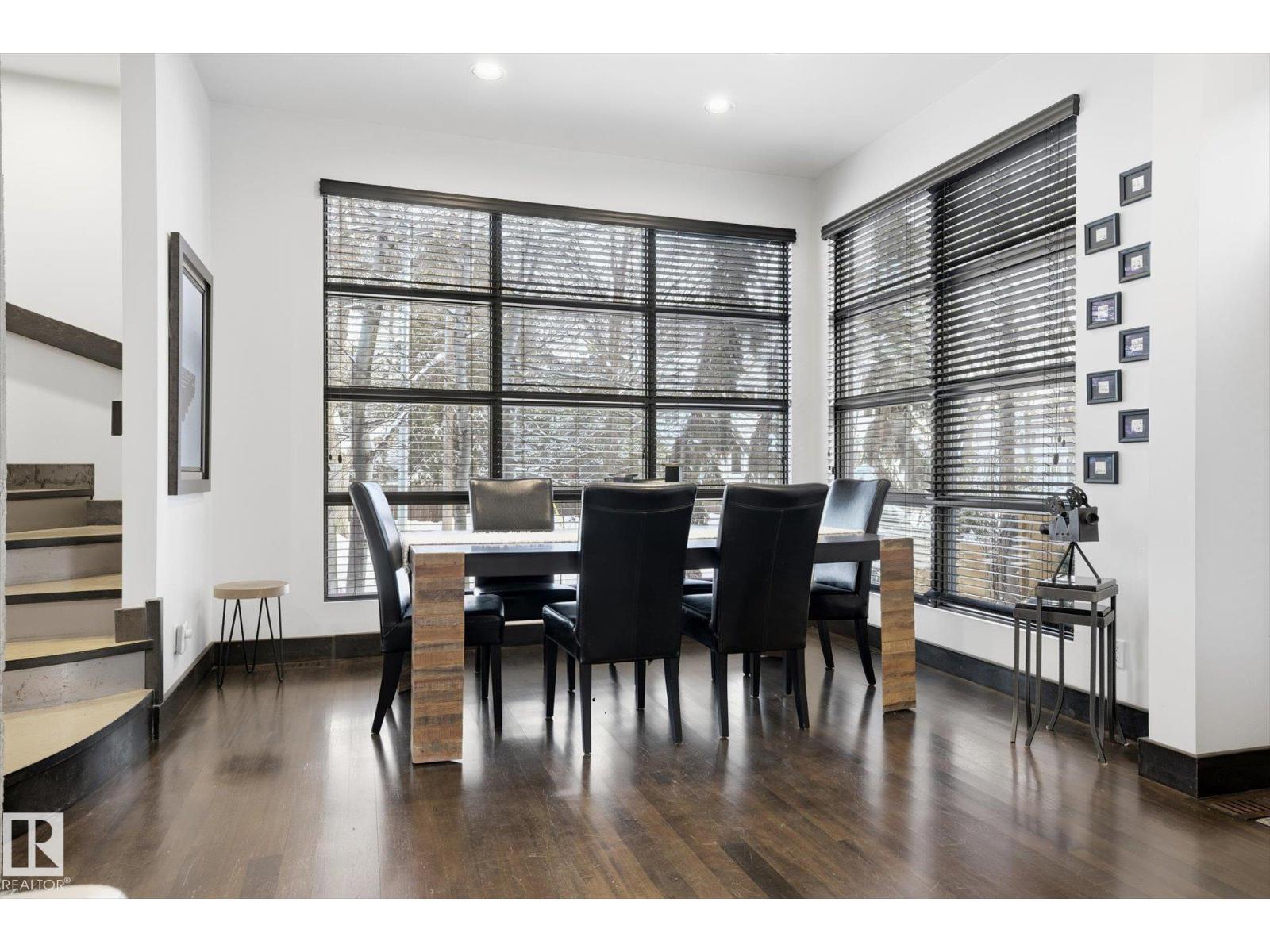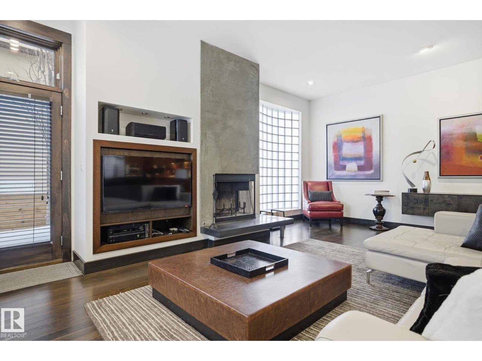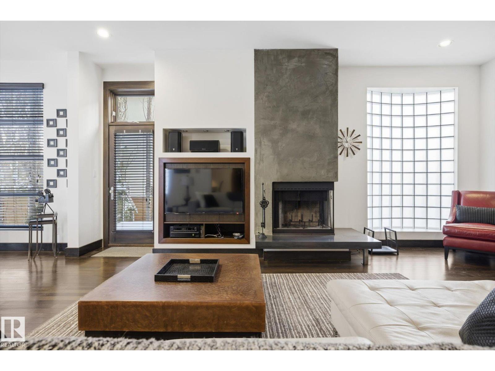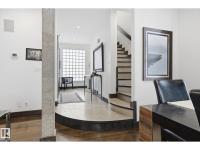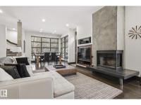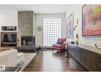 Modern, Architecturally designed two-storey home, ideally located within steps to Mill Creek Ravine. This impeccably built residence offers 2 bedrooms and 2.5 baths, with 10' ceilings on the main level and striking concrete and steel accents throughout. Features include triple-glazed windows, in-floor heating, custom cabinetry, central A/C, and luxurious finishes. The main floor showcases an open-concept w. light-filled spaces. The chef’s kitchen has custom cabinetry, granite countertops, a massive island, and top-of-the-line appliances, including a built-in Miele coffee machine. The great room features a f/p and patio doors opening to the yard, complemented by a large dining area and stunning south- and east-facing windows. The upper level is an executive retreat, highlighted by an expansive primary bedroom with custom cabinetry, a fireplace, and a spa-inspired ensuite. Garden doors lead to a private rooftop. Bsmt. w. bedroom, full bathroom. Under-drive dble garage w. heated driveway. (id:6769)