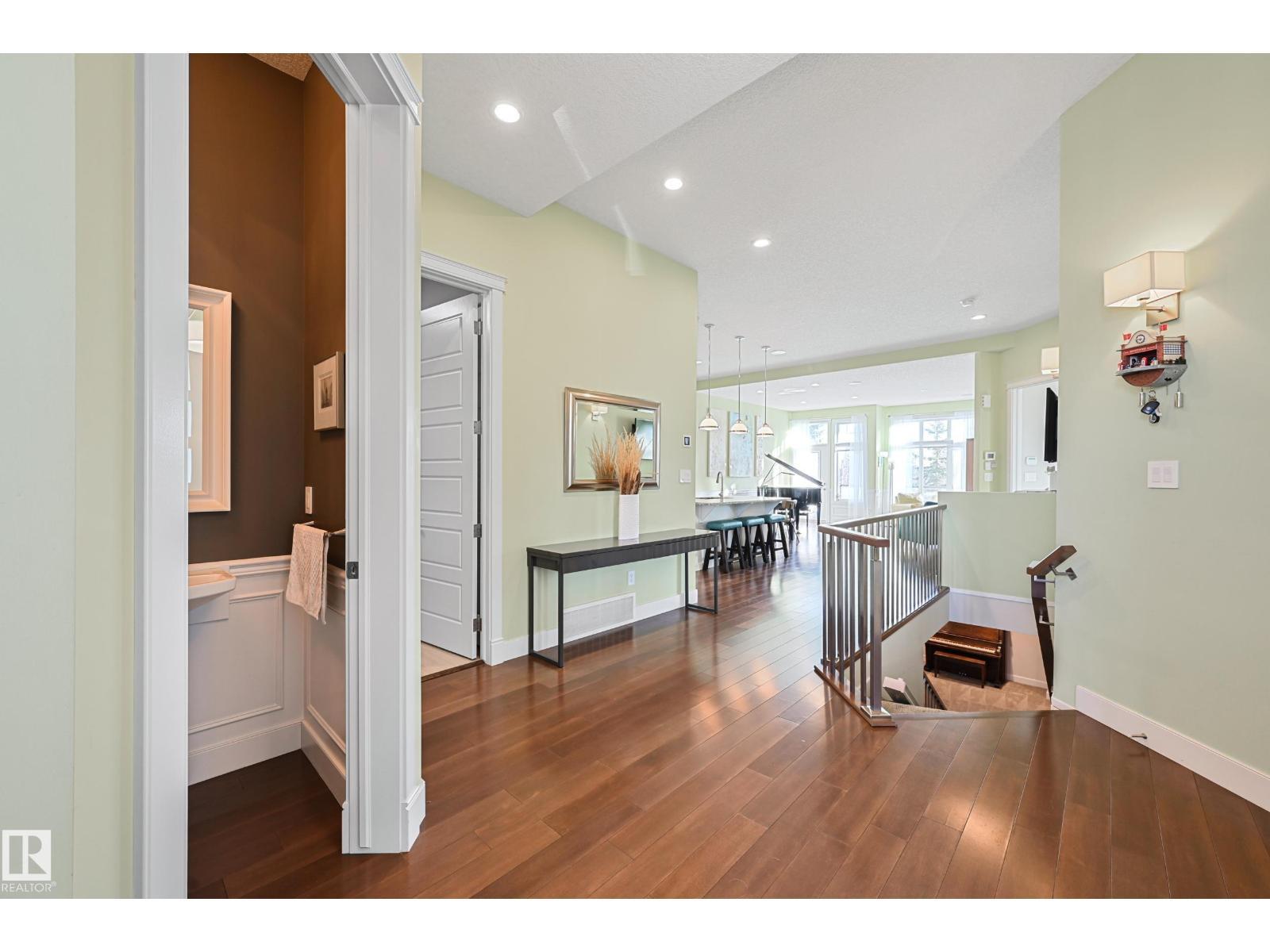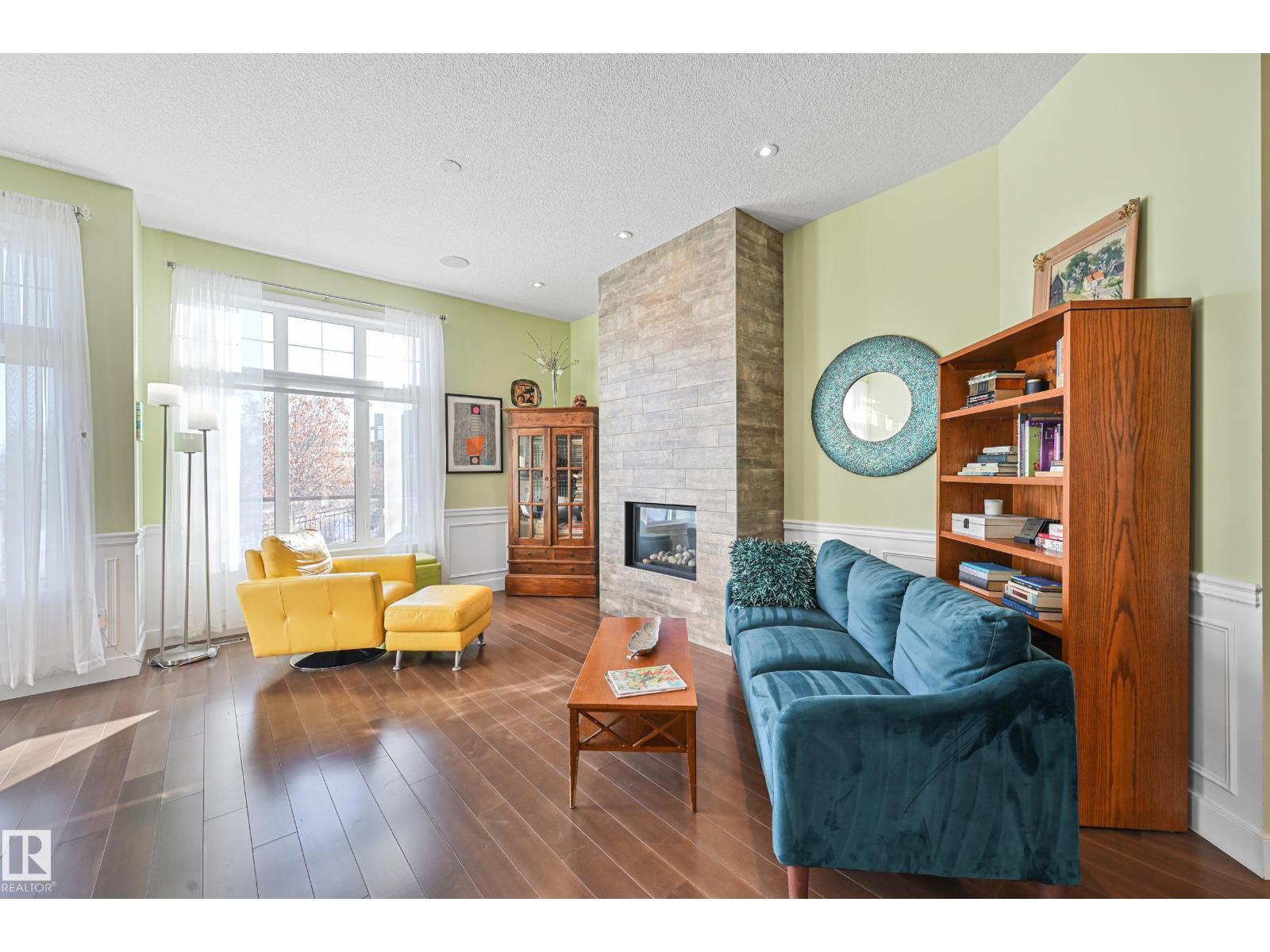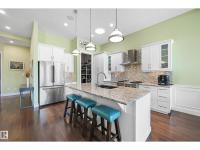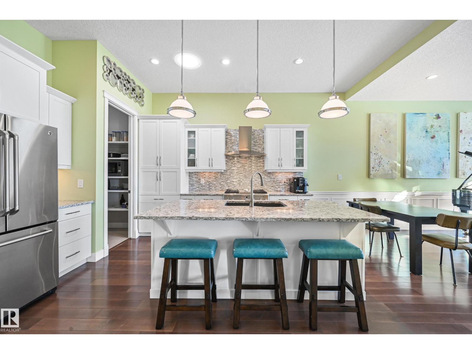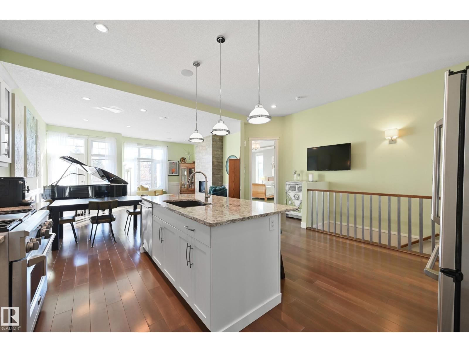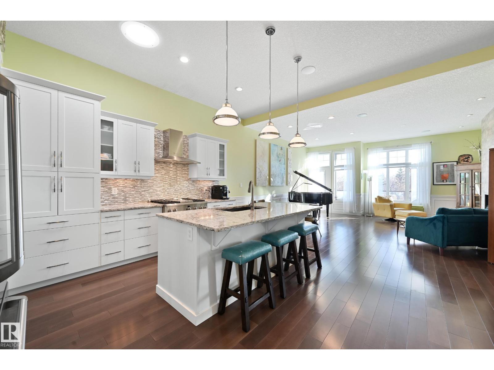 Highly sought after Cascades of Larch Park, backing ravine & fronting walking trails, ponds & park. Fully finished bungalow, offering approx 3300sf of living space w/3 living areas, 3 bedrooms +2 flex rooms. Gleaming hardwood greets you through an open floorplan & rays of natural light. This executive home features 9' ceilings, wainscoting, built-in speakers, upgraded mechanicals & in mint condition. Sunny west facing den is perfect for a home office/library. Great room highlights a stone surround fireplace & provides direct access to balcony/ravine views. Bright kitchen is equipped w/plenty of storage space, white maple shaker cabinets, S/S upgraded appliances, granite counters & walkthrough pantry. Spacious dining nook can accommodate extended dining. Large primary bedroom w/ample windows, 5pc ensuite & dressing room. Dual seating areas on recreation level, wet bar, gym/flex room, 2 bedrooms, 3pc bath is perfect for extended guest stays. Privately located, surrounded by nature & well maintained complex. (id:6769)