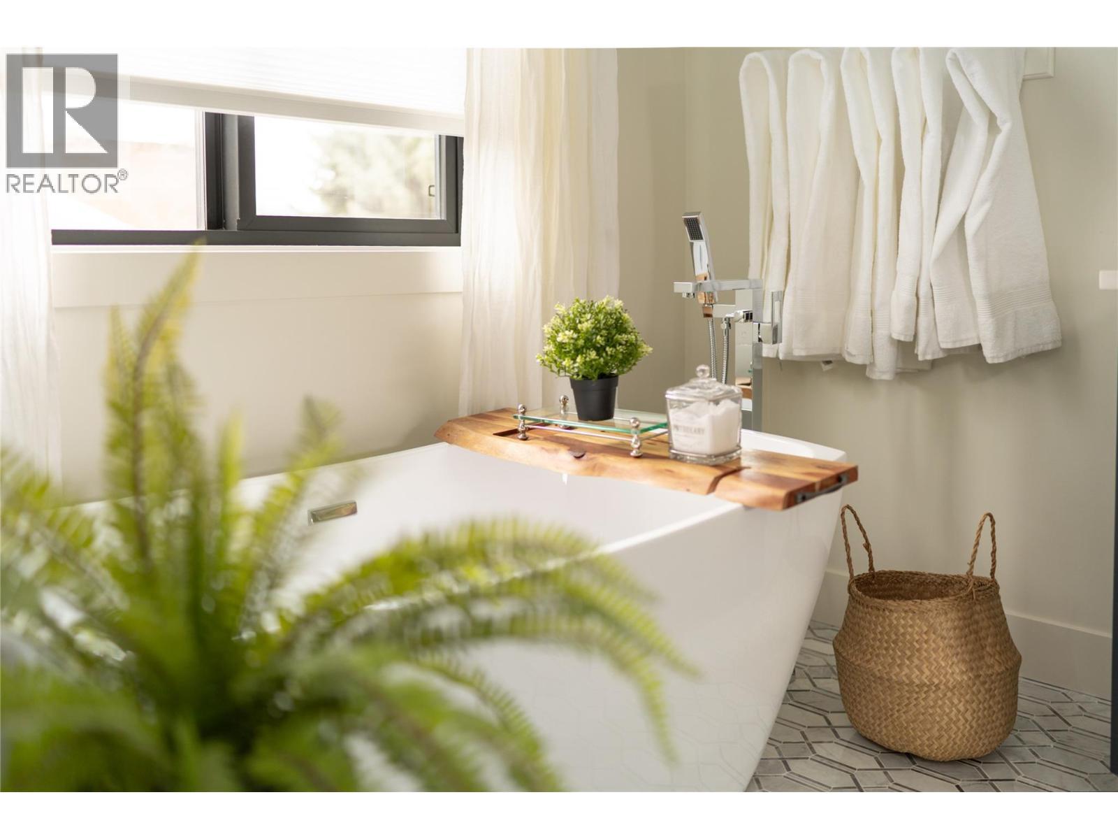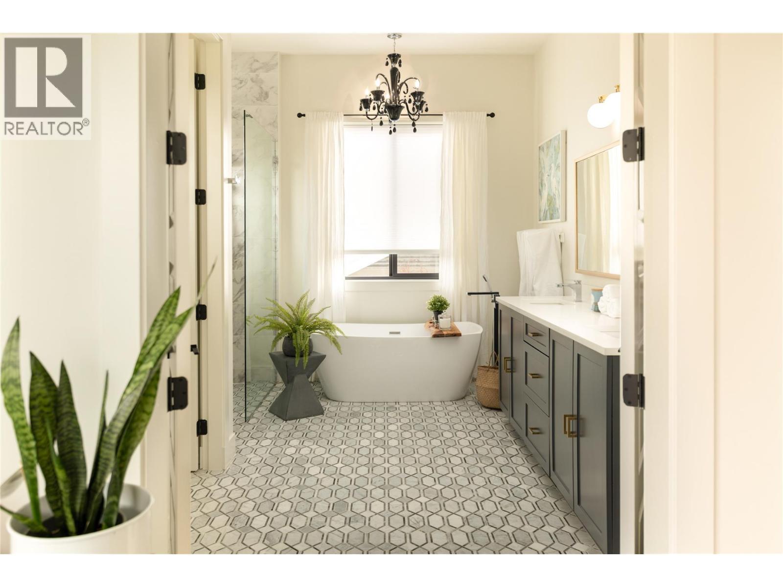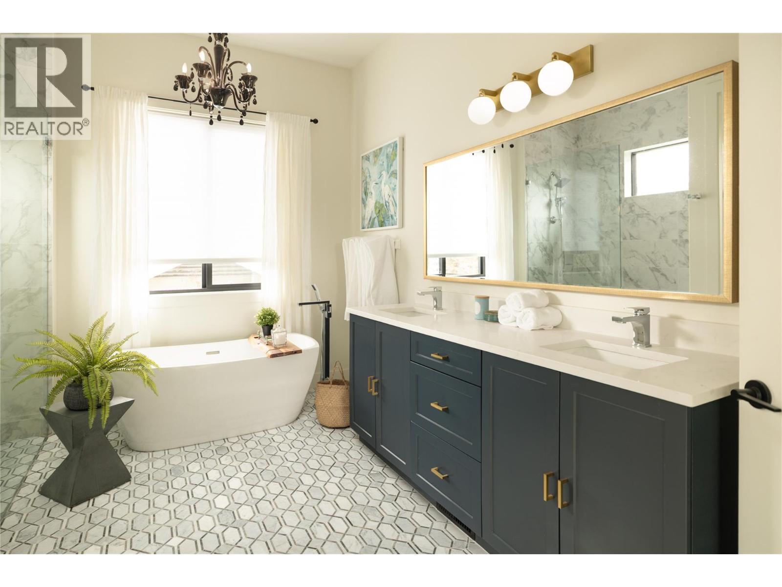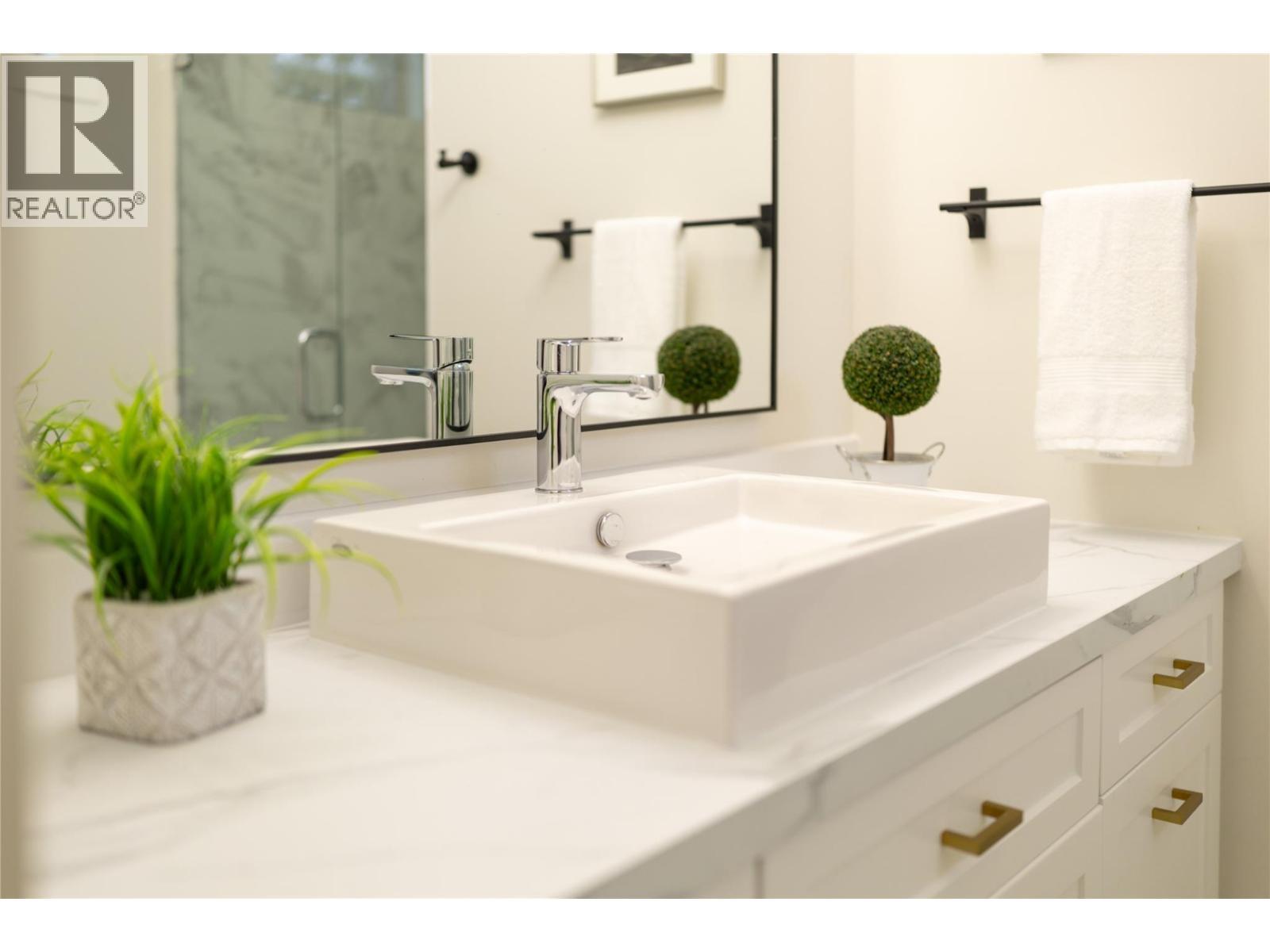 A meticulously crafted, custom-built residence where timeless West Coast inspiration meets the relaxed elegance of the Okanagan—just steps from the beach and surrounded by mature greenery in one of the area’s most coveted walkable neighbourhoods. Influenced by classic Kitsilano architecture, the exterior blends natural stone and wood, creating enduring curb appeal. Inside, soaring 12-foot ceilings and luxurious wide-plank hardwood flooring establish a calm, architectural presence throughout. The main level unfolds into an impeccably designed open-concept living space, created for both everyday ease and elevated entertaining. A striking 11.5-foot island anchors the kitchen, complemented by premium appliances, Dekton countertops, and a generous walk-in pantry. Dining and living areas are thoughtfully centred around a custom fireplace, while softly rounded doorways and refined detailing add warmth and continuity. Glass doors extend the living space outdoors to a private backyard sanctuary featuring a heated, saltwater in-ground pool, expansive patio areas for gathering, and dedicated she shed and he shed spaces—ideal for work, wellness, or creative pursuits. Upstairs, a wide staircase with integrated lighting leads to a serene primary retreat designed for privacy and restoration. The ensuite is beautifully finished with Bianca Carrara marble countertops, a sculptural soaker tub, dual vanities, a seamless glass shower, and heated flooring. Three additional bedrooms and two thoughtfully finished bathrooms complete the upper level. A fully self-contained, legal two-bedroom suite with private entrance, its own laundry, and a bright living space adds flexibility while maintaining separation and discretion. Just minutes from beaches, parks, shops, cafes, and the lake—this home offers a rare balance of refined living and daily convenience in one of the Okanagan’s most desirable settings. (id:6769)