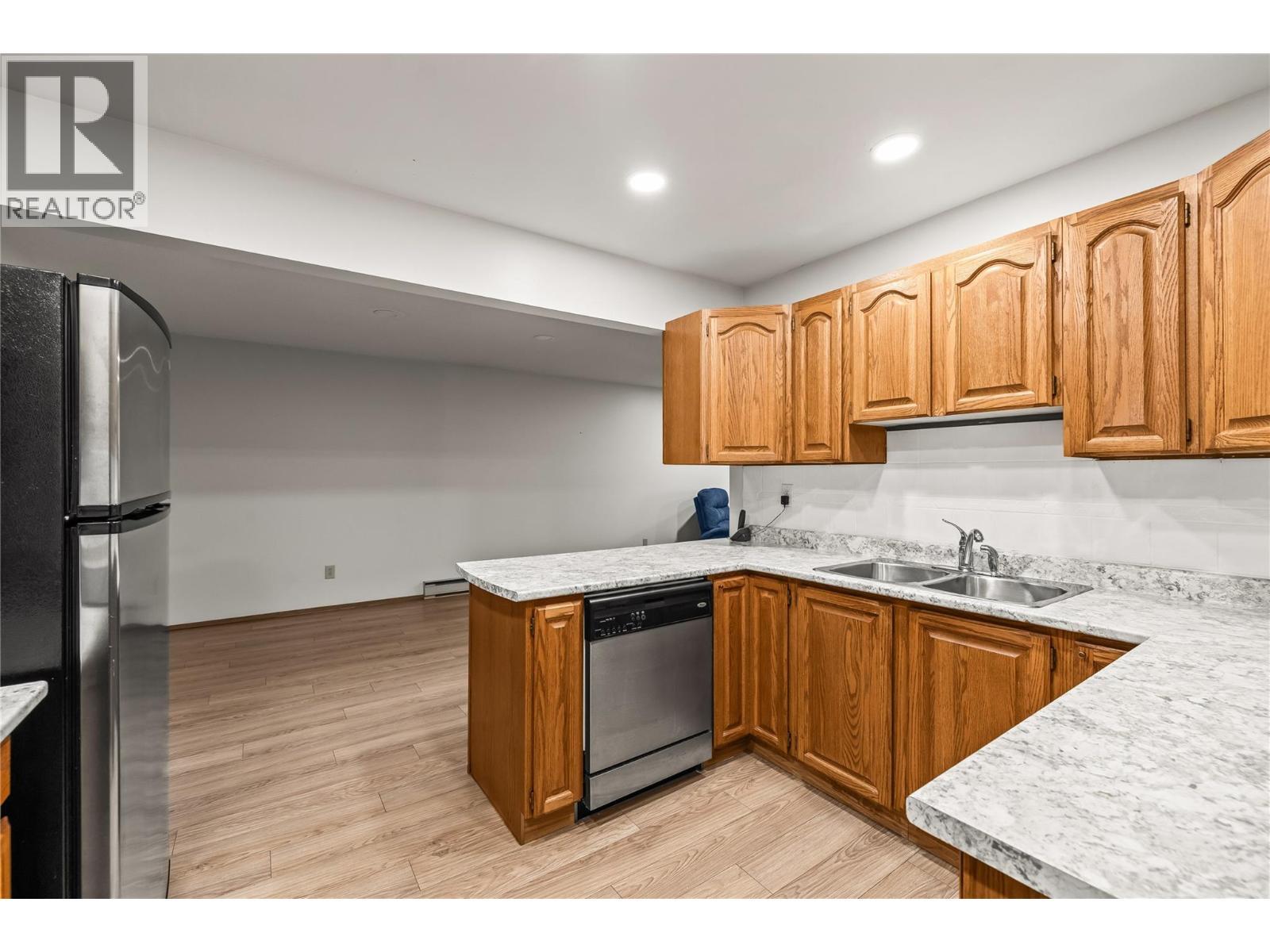 You will love living here at Springfield Manor a +55 community, no pets, quiet building and a great central location. Top Floor offers lessor noise as no occupants above unit, also 2 skylights offer more natural light. East facing sunroom to greet the morning sun as you look up onto Black Mountain views and a sunroom that is not too hot in the summer afternoons. 2 skylights for lots of natural light, primary bedroom /ensuite/ large closet and 2nd bedroom with adjacent 2nd full bathroom. Kitchen has newer counter top, newer laminate flooring throughout, laundry has pantry extra storage too. This unit offers wheelchair access as all doors for wheelchair allowance, that is if required. This is a well maintained building offering, presently hallways being freshly painted and new carpets being installed. 2 storage lockers (1 on the 3rd floor and the other off parkade) and 1 covered parking stall to secure entry at the elevator. Lots of guest parking. (id:6769)