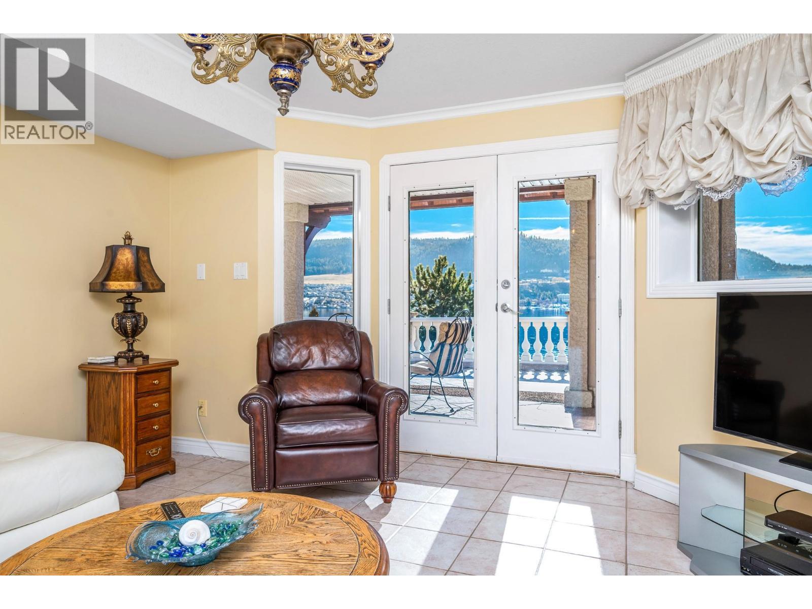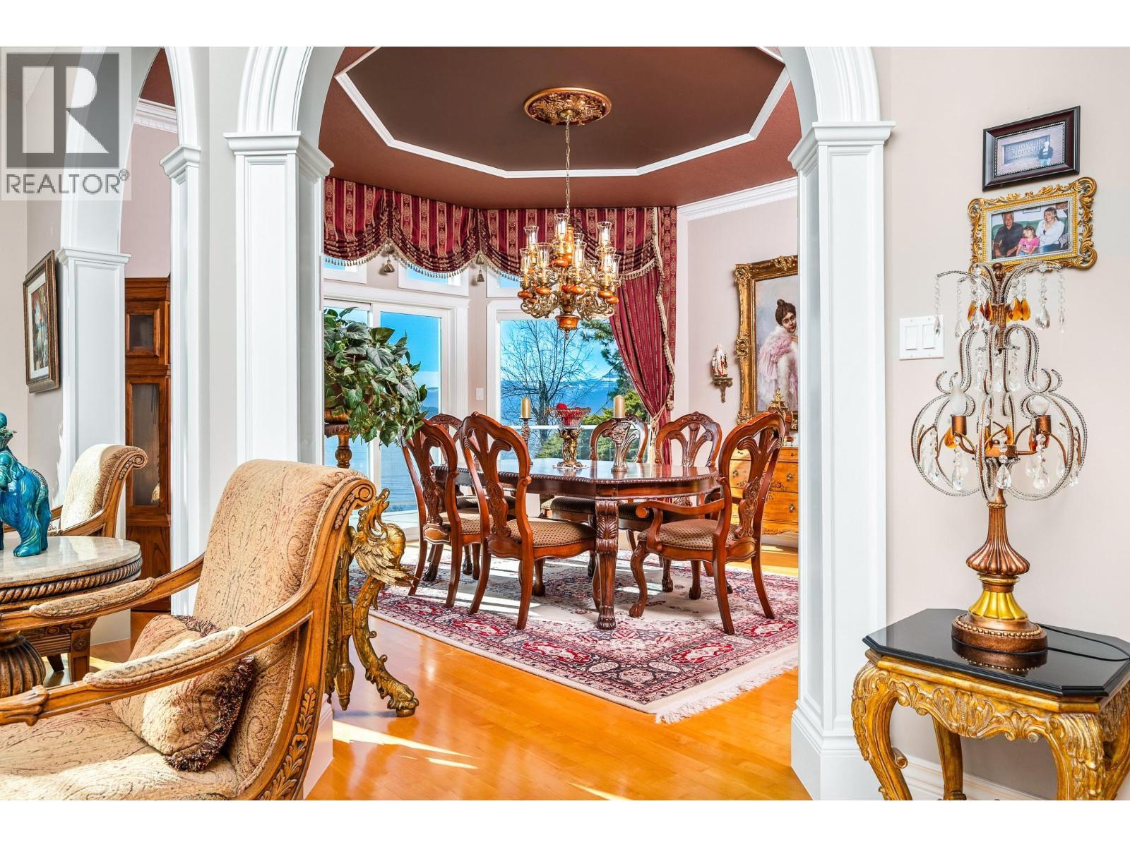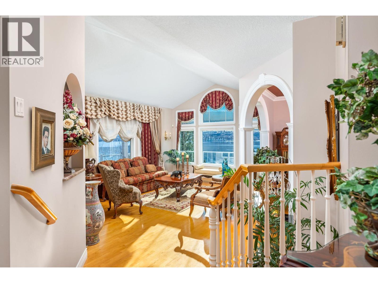 Okanagan lake shore living with so much privacy! Barely 10 minutes from the Vernon city center, just past the popular Kin Beach, watch for the gates to this .56 acre estate. The south/west facing lake views are inspirational and promise sun right until sunset! Follow the walkways through the mature landscape, past the bridged waterscape and take the 42 easy steps to your 79ft of completely level waterfront! Check out the pergola for shaded respite! The home offers a comfortable yet serene elegance with hardwood floors, heated tile floors, elevated and coffered ceilings, impressive arches to define living areas, unique hand picked lighting fixtures & windows everywhere to drink in the lake views. Entertainment sized deck off the main level and partially covered tiled deck of the lower level! Updated kitchen with impressive granite island and gas range and bay window breakfast nook. Step down to the formal dining room and living rooms or escape behind the french doors to the family room with its cozy gas fireplace and built in library. Follow the curved stairway to the open landing of the upper level – reserved entirely for the primary suite with decadent 5 piece ensuite and his and hers dressing room. The lower level can be a completely closed for a private 3 bedroom suite for family or lingering guests! Full kitchen and family room that opens to huge private deck and beach access. Double garage and loads of level parking! Mature, colourful landscaping with sprinkler system. (id:6769)