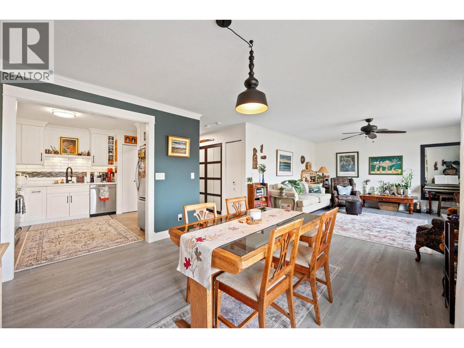 This 985 sq. ft. top-floor condo offers a spacious and functional layout in a central Penticton location. The bright, open-concept living and dining areas are complemented by a modernized kitchen featuring stainless steel appliances. In addition to the large primary bedroom, the floor plan includes a dedicated small office—perfect for a hobby room or workspace—along with the convenience of private in-suite laundry. Outdoor living is a highlight with a good-sized, north-facing covered deck that provides a comfortable retreat while avoiding the intense heat of the midday sun. This 55+ building is a pet-free environment that has been well-maintained, including the recent installation of a new elevator in 2025. One dedicated covered parking spot is included. Perfectly situated for an active lifestyle, the home is just a short walk from local shopping and restaurants, with both Okanagan Lake and Skaha Lake only a quick drive away. (id:6769)