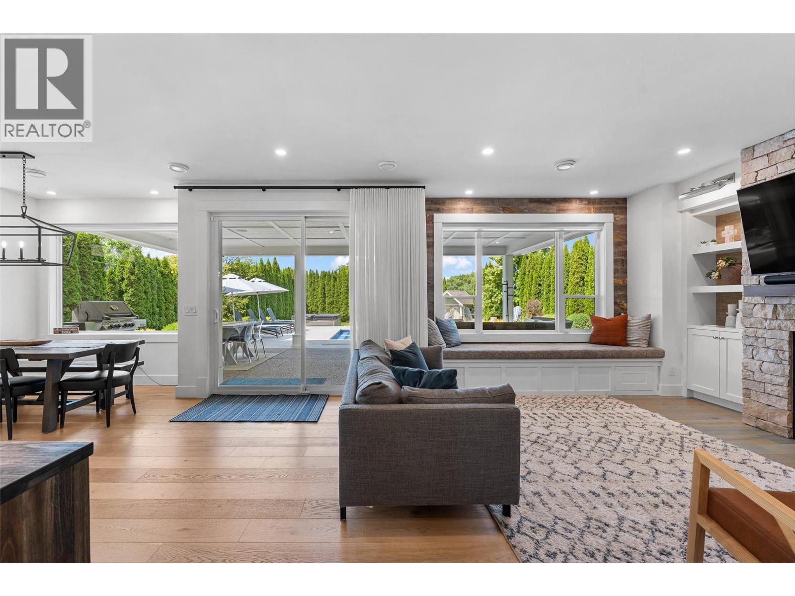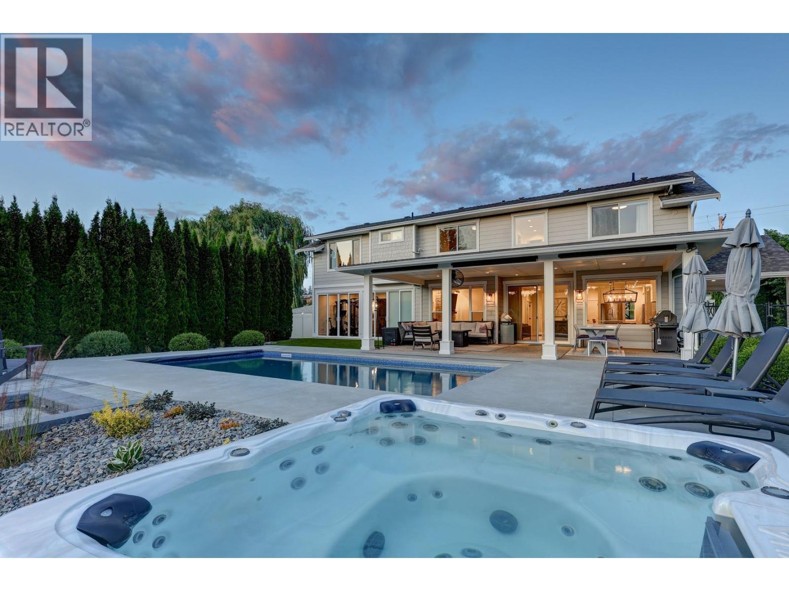 Gracefully positioned behind a gated entry on a manicured 0.42-acre property, this is a timeless craftsman-style residence offering privacy, a functional layout, and resort-style amenities just minutes from Kelowna’s finest conveniences. Showcasing exceptional quality throughout, this 4-bedroom, 5-bathroom home is designed for elevated everyday living. The chef’s kitchen is anchored by a generous sized center island, quartz countertops, and premium KitchenAid appliances, flowing seamlessly into the dining and living areas where wide-plank hardwood, custom built-ins, and a stone-clad gas fireplace create an atmosphere of luxury. French doors lead to an exceptionally private outdoor sanctuary complete with a covered lounging area, integrated audio, natural gas hookup, and a heated saltwater pool, a spa surrounded by mature cedar hedging, tiered gardens, and lush lawn. Thoughtful design extends indoors with a main-floor gym and ensuite, a versatile office, and a mudroom with built-in storage. Upstairs, the expansive primary retreat offers a spa-like ensuite with heated tile floors and a walk-in shower. Three additional bedrooms, a five-piece bath, laundry, and a bonus room with wet bar provide generous space for family and guests alike. The oversized triple garage is fully finished with epoxy floors, built-in cabinetry, and RV parking. This is a rare opportunity to own a gorgeous residence in a quiet, coveted enclave. (id:6769)