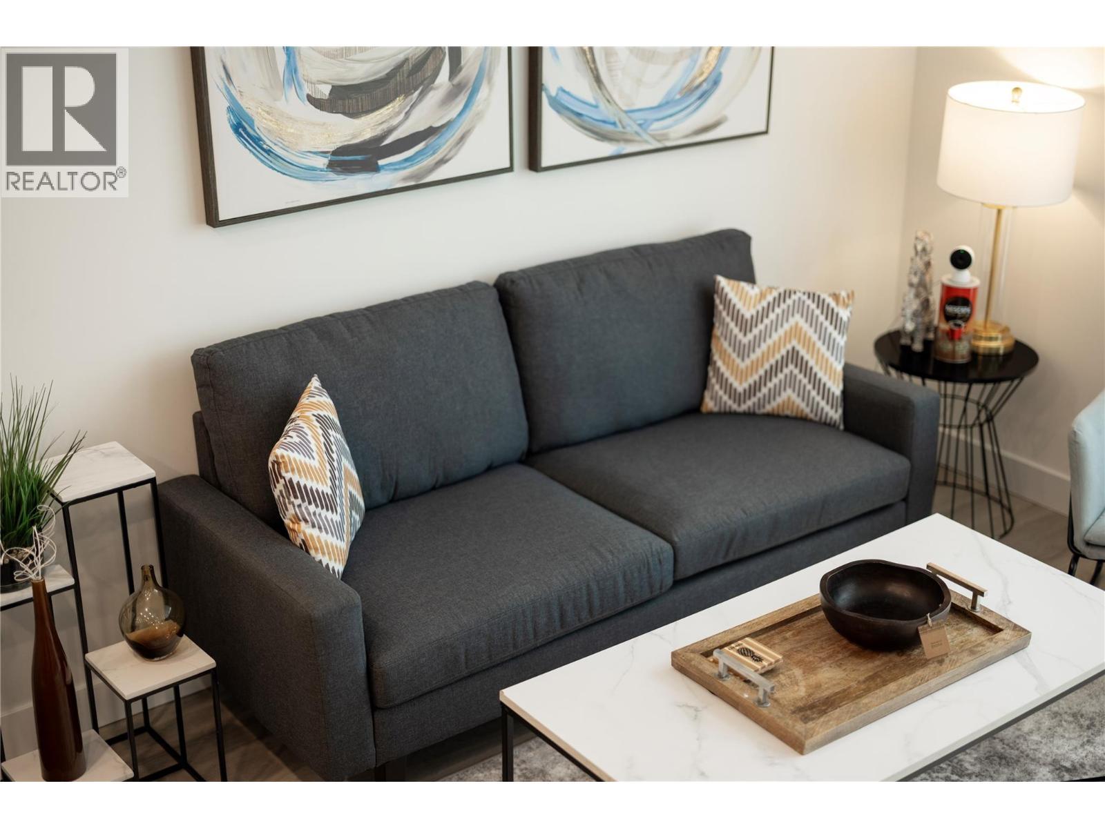 Experience elevated urban living from the 25th floor of The Bertram in downtown Kelowna. This one-bedroom plus den residence offers a bright, open-concept layout with large windows, built-in roller blinds, and a glass-railed balcony. Enjoy south and southwest views of Okanagan Lake, the mountains and the city. The kitchen features a tile backsplash, stainless steel appliances, and a dedicated coffee station with floor-to-ceiling storage and an outlet for your favourite brewer. The versatile floor plan includes a den for a home office, dual bathroom access from the hallway and primary bedroom, and in-unit laundry. This unit comes with one parking space and a flexible pet policy allowing up to two pets with no size or height restrictions. Beyond the suite, The Bertram provides a comprehensive lifestyle through its diverse building amenities. Relax at the rooftop pool and hot tub or stay active in the modern fitness center. For those working from home, the building features dedicated co-working spaces on both the top and ground levels. Outdoor enthusiasts will appreciate the 6,000-square-foot sixth-floor podium, which includes a dog run, community gardens, and space for BBQing and bocce. Situated in a prime downtown location, this concrete tower is surrounded by local dining, retail, and transit. With quick possession possible, you can move into this amenity-rich community immediately. GST paid. Furnishings are not included but are available for separate purchase. (id:6769)
