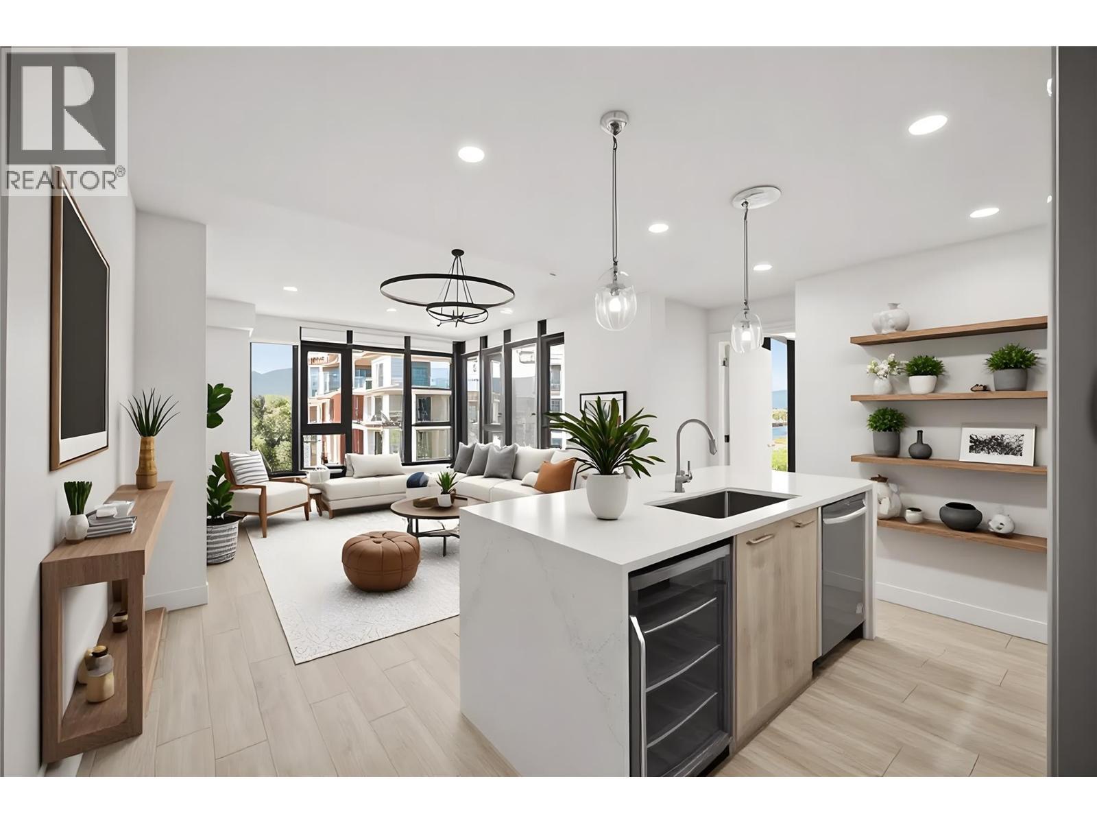 Priced well below assessed value of $854,000! Live steps from the shoreline in Aqua Waterfront Village, an elevated lakefront community in Kelowna’s desirable Lower Mission. This 2 bed, 2 bath home offers approx. 885 sq. ft. of intelligently designed interior space with two bedrooms, expansive windows and a spacious S/W balcony, offering natural light and lake views above the treetops. A split bedroom layout allows for privacy and flexibility. The kitchen features modern two-toned cabinetry, quartz countertops, under-cabinet LED lighting and a premium stainless steel appliance package, incl. a wine fridge. Enjoy luxury wide-plank vinyl flooring throughout the kitchen, living/dining area and bedrooms, blackout roller shades in both bedrooms and an energy-efficient central heating/cooling system. The spa-inspired bathrooms showcase porcelain tile and quartz countertops. 1 secure parking stall (with the rare chance to buy a 2nd stall), 1 storage locker, 1 bike locker are included. Amenities include an outdoor pool and hot tub, gas fire pits and BBQ’s, a fireside lounge and co working area, 2-level fitness centre, pet wash and bike wash and maintenance area. Vacant and ready for quick possession. Only a 5% deposit required. Buyer to verify all details and measurements if deemed important. All offers must be written on the Developer’s CPS. (id:6769)