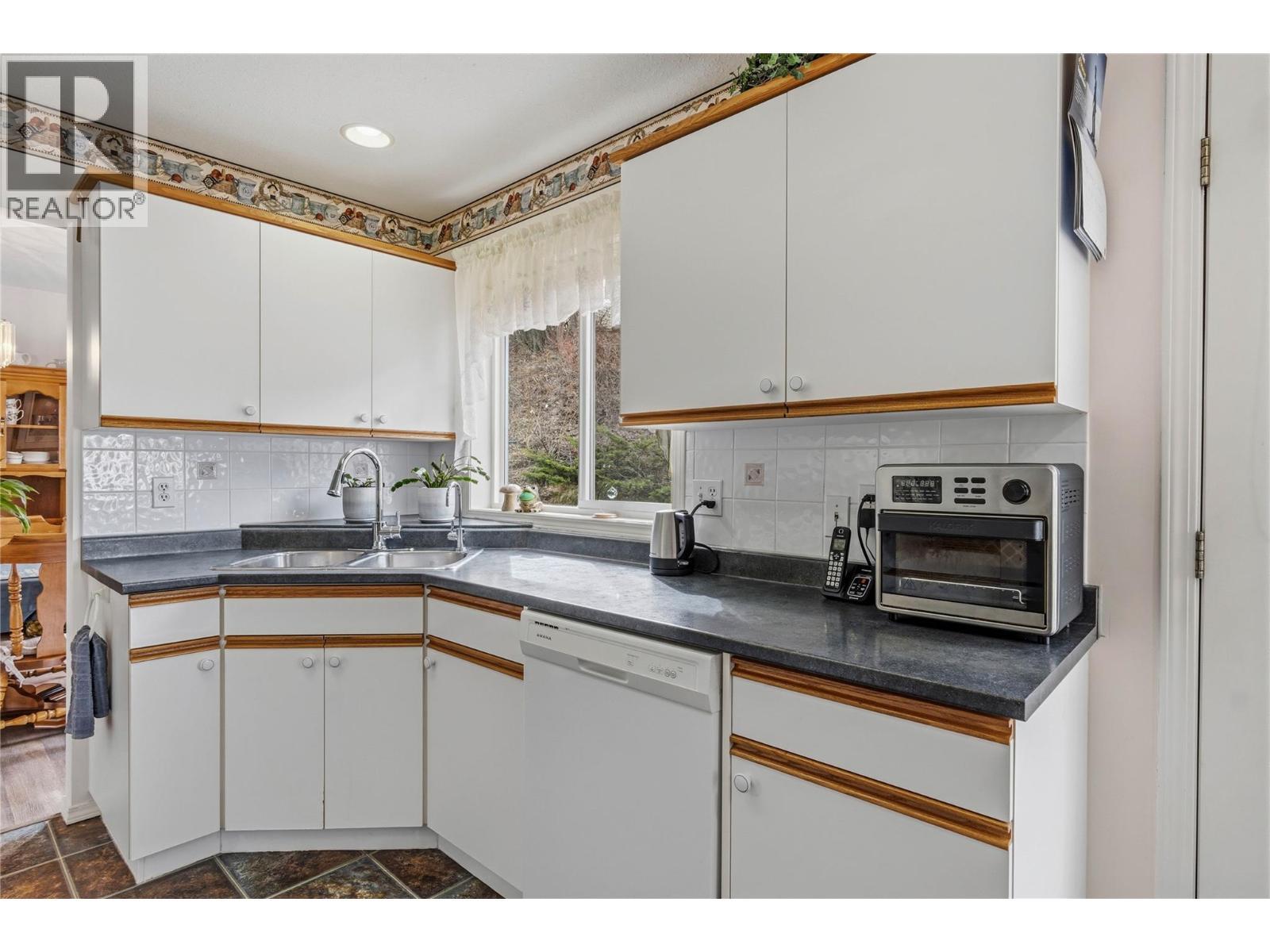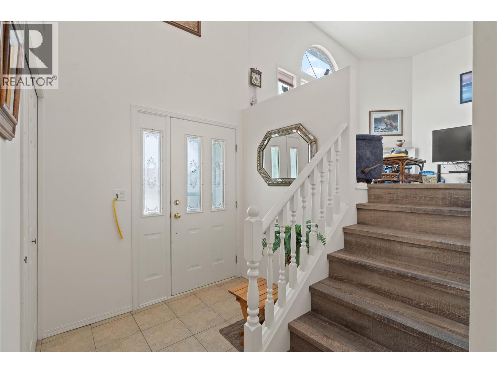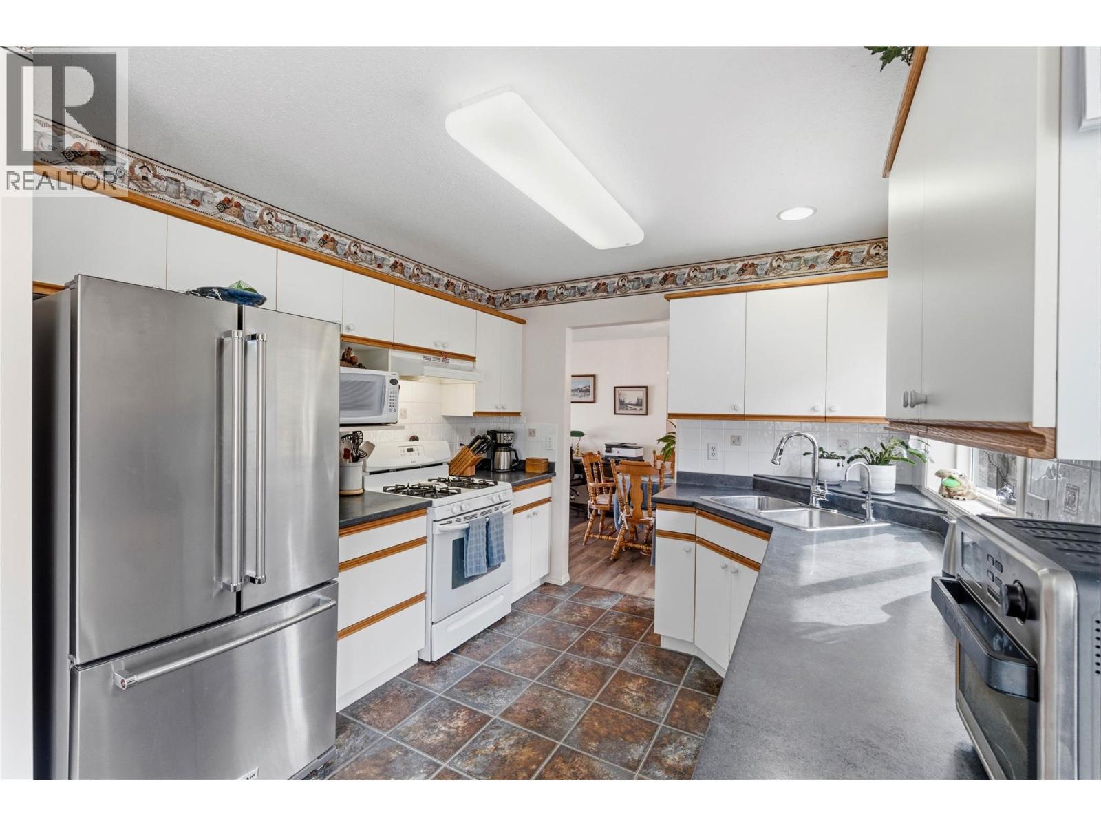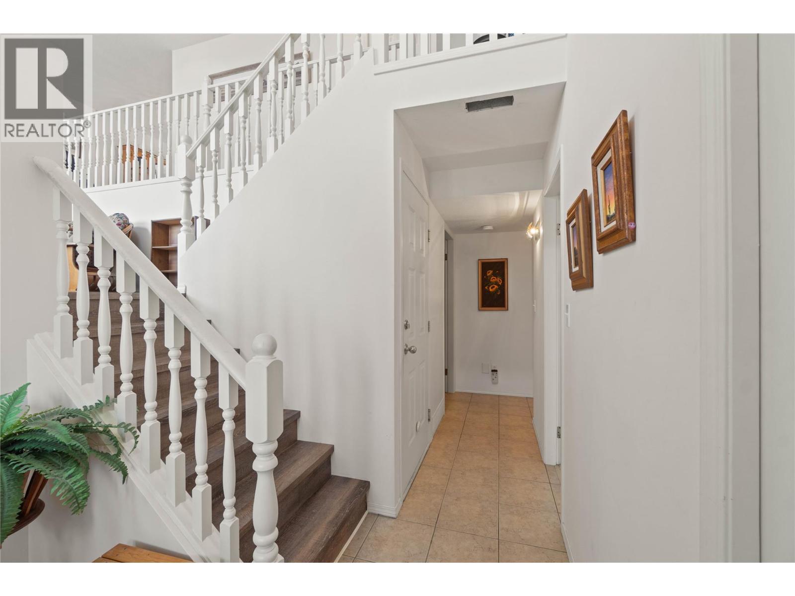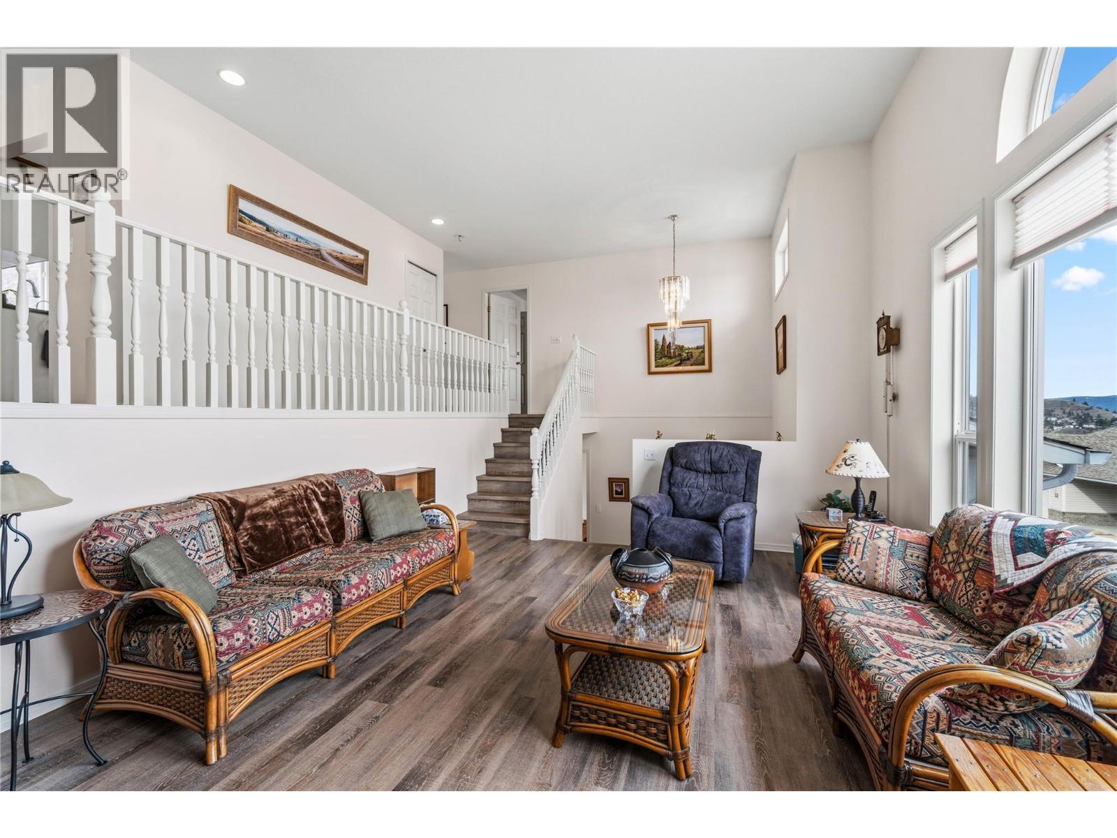 Elevate your lifestyle in this stylish end-unit townhome with stunning valley views and a double garage, designed for professionals who value space, light, and contemporary comfort. Step into the grand living room where soaring vaulted ceilings rise to the upper mezzanine level, anchored by a striking gas fireplace—perfect for relaxing after a long day or entertaining guests. Updated vinyl plank flooring adds a modern touch throughout the main living areas. The mezzanine level features a private primary bedroom retreat with a walk-in closet and elegant 4-piece ensuite, offering a quiet escape above the main living space. The spacious kitchen is designed for both function and style, featuring abundant cabinetry and counter space, a gas range, fridge, dishwasher, and RO water tap. A bright breakfast nook opens to the backyard where garden beds with sprinklers and a covered deck create the perfect setting to enjoy sunset views. The formal dining area overlooks the living room and valley beyond, adding a dramatic architectural touch for dinner gatherings. On the entry level, guests are welcomed by an elegant foyer, along with a second bedroom and convenient 3-piece bath—ideal for guests, a home office, or roommate. A laundry closet includes washer and dryer. The large recreation room for future—games room, home gym, or media room—with storage space attached. Comfort and efficiency are built in with a newer high-efficiency furnace, hot water tank (2017), C/Air, and C/Vac (id:6769)