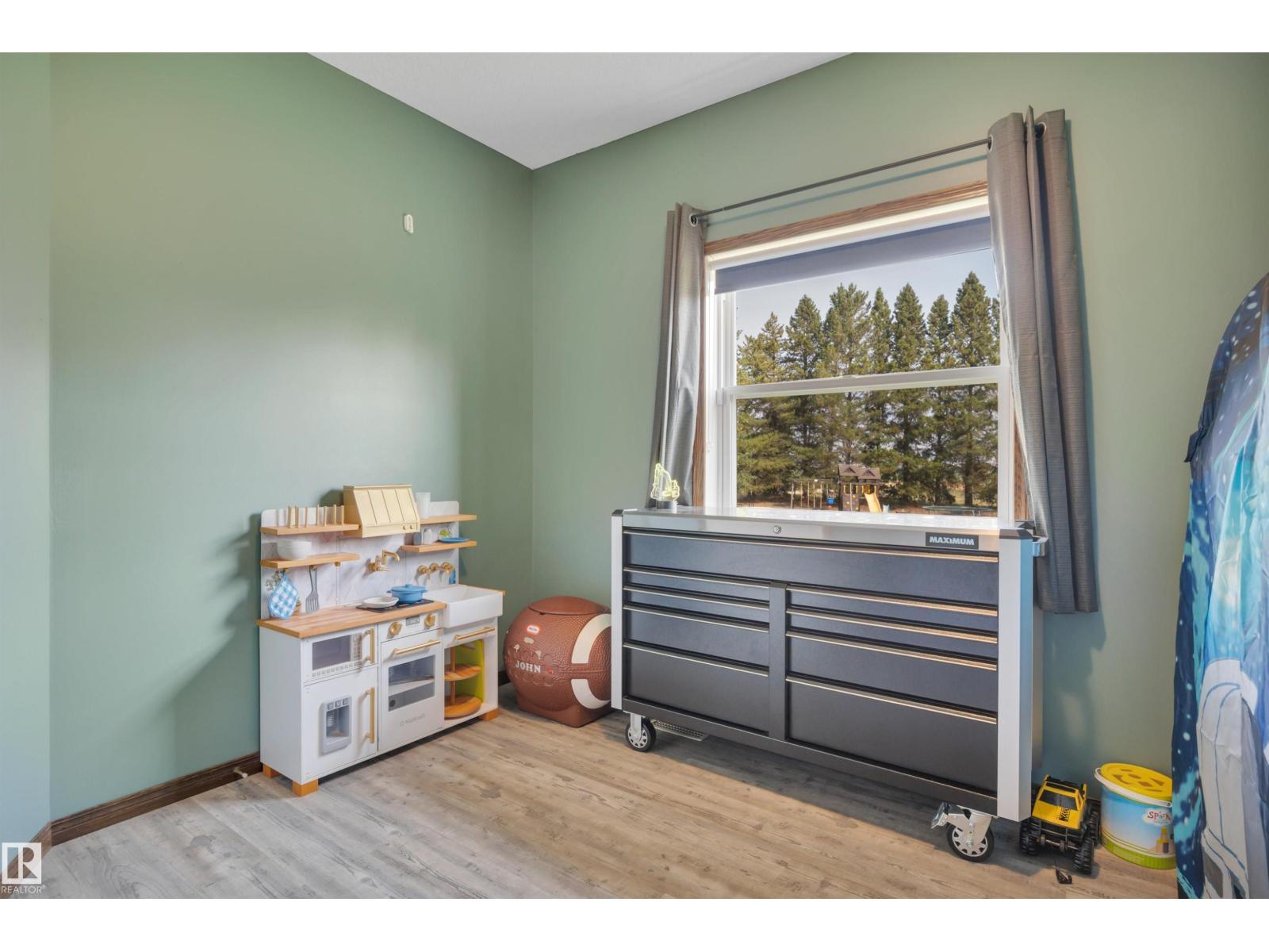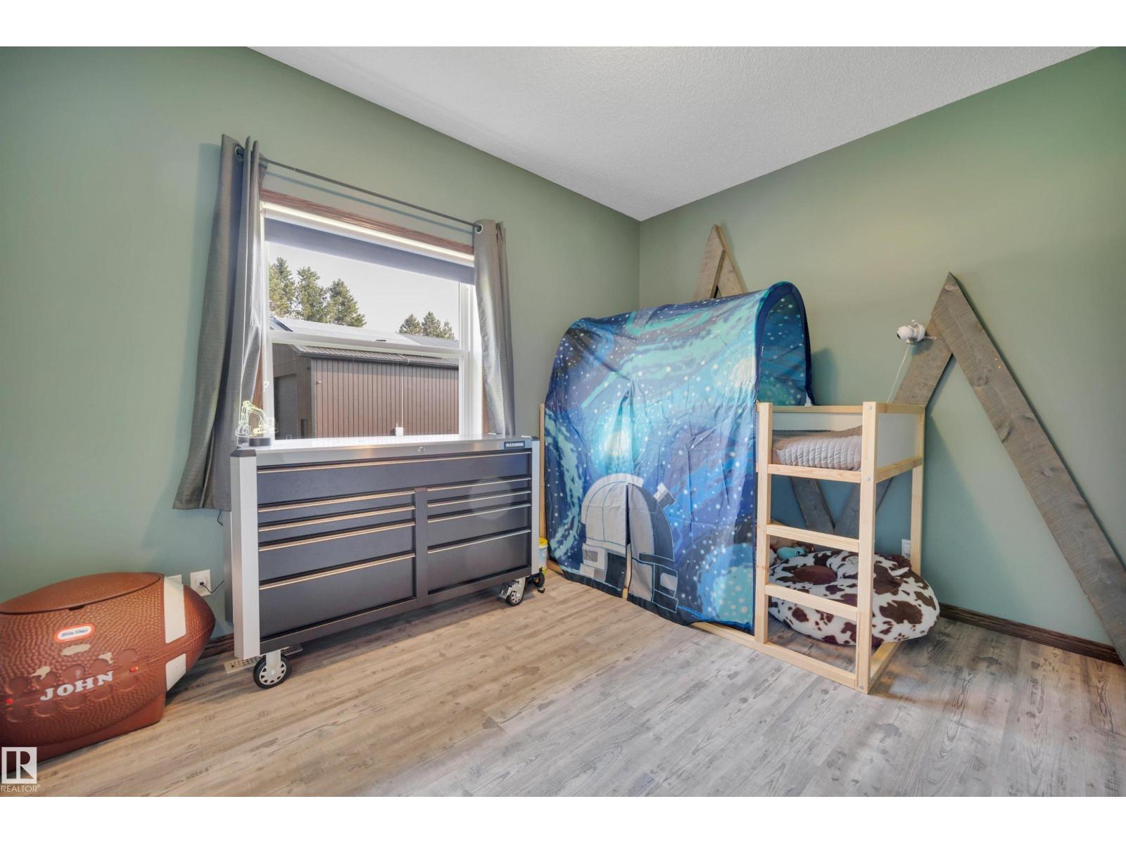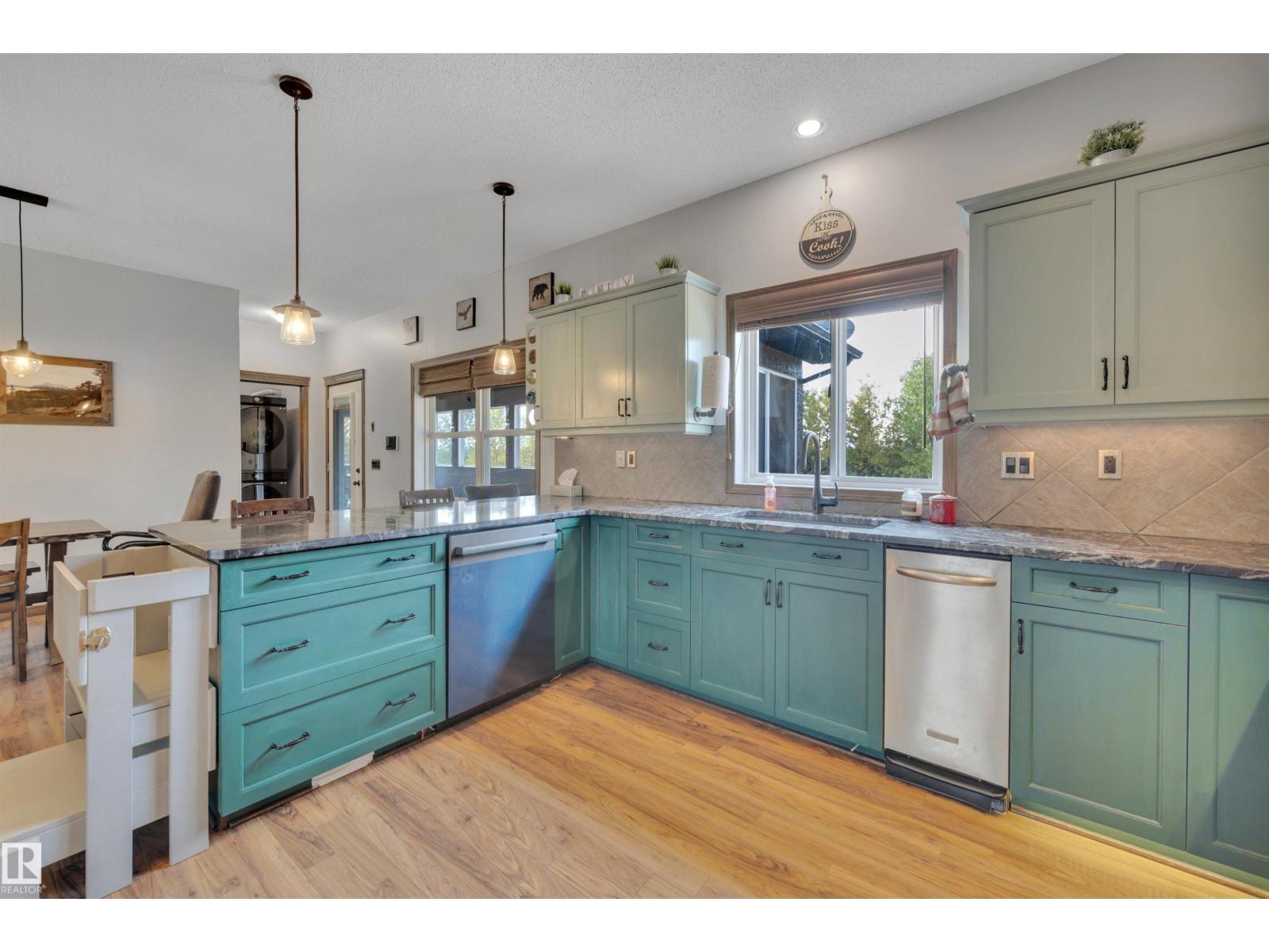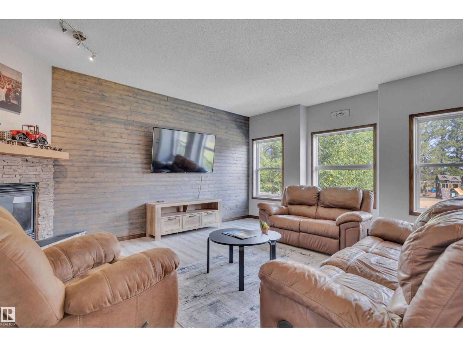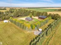 BEAUTIFULLY PRESENTED! 50' x 60' SHOP! TREED & PRIVATE! This 1773 sq ft 5 bed + 2 den, 3 bathroom raised bungalow on 4.13 acres out of subdivision is turnkey & only minutes to town! Feat: new shop w/ 14'x14' doors & solar panels, A/C, in floor basement heating, 9' ceilings, covered sunroom / deck, powered shed, custom grain bin bar & firepit space, & more! Your entryway leads into the large living room w/ chic woodgrain feature wall & gas fireplace; perfect spot for family visiting. Massive farmhouse kitchen w/ granite countertops, massive fridge / freezer combo, new oven, & spacious eat in dining. 3 bedrooms up, including the primary bed w/ walk in closet & 4 pce bath. Main floor laundry & 4 pce bath. The basement is fully finished, w/ rec room w/ pool table & wet bar, theatre room for movie night, 2 massive bedrooms, 3 pce bath w/ infared sauna. 2 dens, & tons of storage room! The yard is incredible! Fully treed perimeter, landscaped; pride of ownership is evident. A must see property! (id:6769)