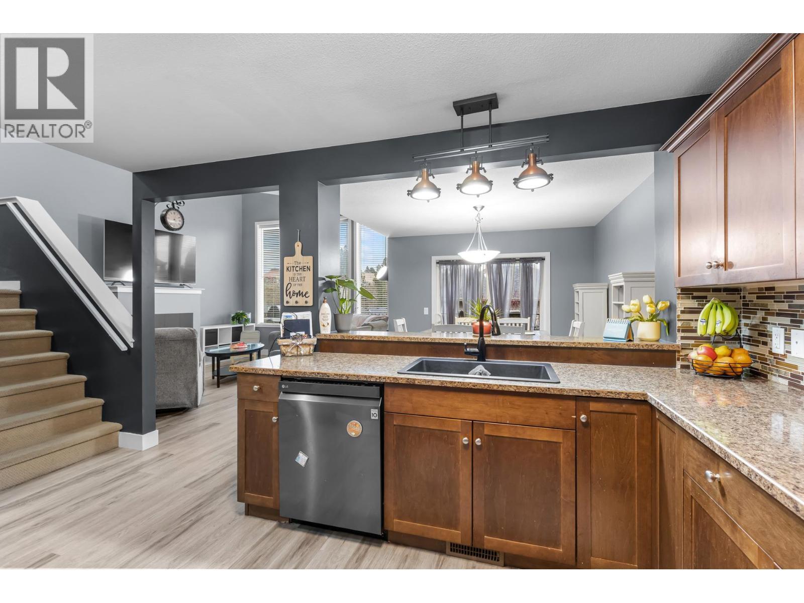 This affordable 4 bedroom move-in ready home is thoughtfully laid out with a generous and versatile floor plan. As you step through the ground level entry and foyer, you will find the main level to be light and inviting with expansive windows, 17ft vaulted ceilings, and open concept living. The spacious kitchen, living, and dining areas are a dream for entertaining. The second level features all three bedrooms, an ideal layout for families. In the fully finished walkout basement you will find a handy 1 bedroom in-law suite with a separate entrance. The home is found in Crown Town, a family and pet friendly community just 15min away from downtown Kelowna, near to award winning Two Eagles Golf Course, and minutes away from the beaches of Okanagan Lake, schools, hiking trails and other amenities. With low strata fees and no Property Transfer Tax it is the perfect place to call home for savvy investors and first-time buyers. (id:6769)