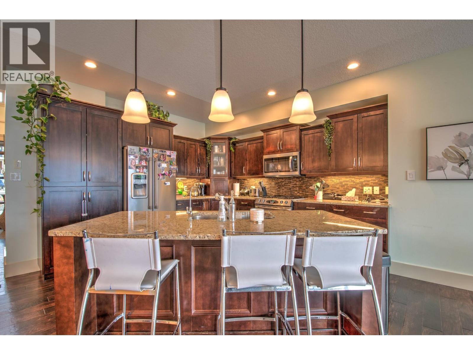 Incredible location overlooking the famous Rail Trail and beautiful Kalamalka Lake, offering stunning lake and mountain views from throughout the home. This walkout rancher features 4 bedrooms plus a front office/den and 4 full bathrooms. The open kitchen with large island and gas stove flows into the living room and out to a massive pergola-covered deck complete with lighting, fan, and gas hookup for your BBQ. Quality finishes include granite counters, hardwood floors, built-in vacuum, underground sprinklers, and wiring for sound. The beautifully landscaped yard features a stunning pond in the backyard. Spacious primary bedroom with large ensuite, plus a separate entrance 1-bedroom suite. Former show home with a large double garage, located on a quiet no-through road in one of the area’s most sought-after neighbourhoods. Pathway access nearby provides easy access to Kalamalka Lake and the beach. (id:6769)