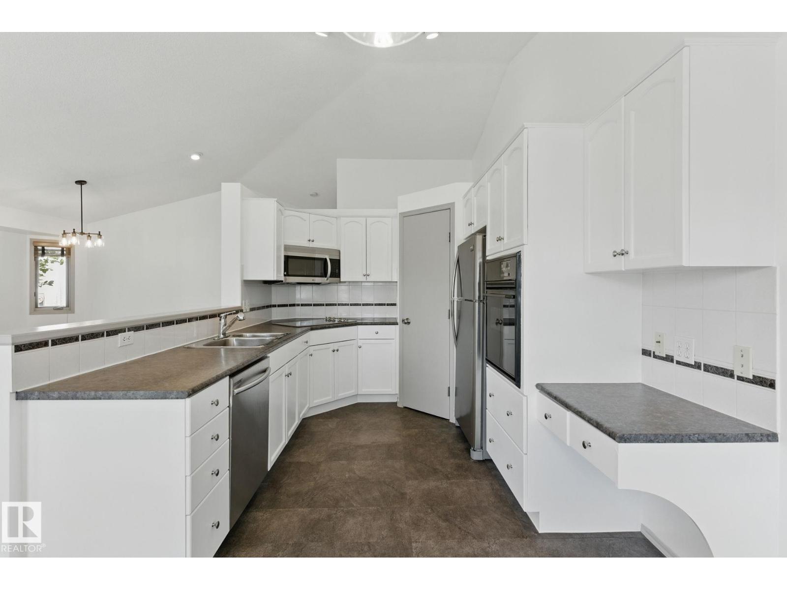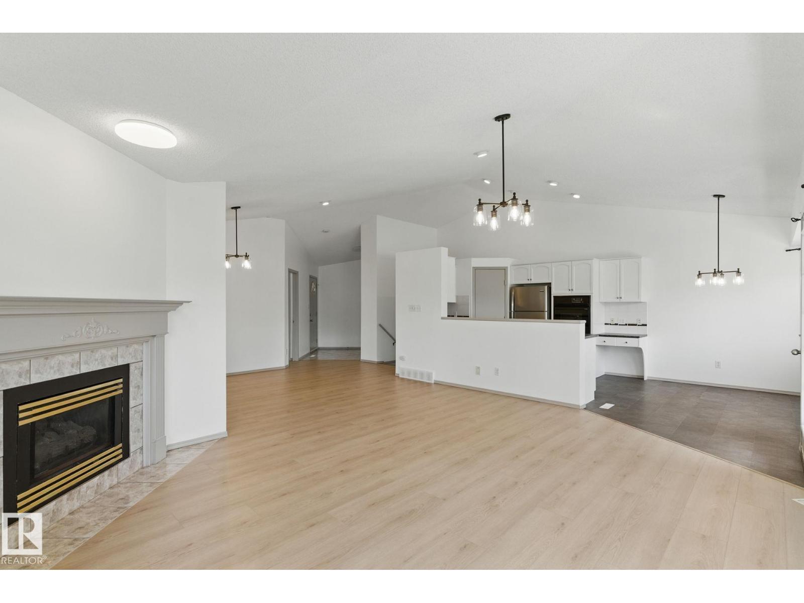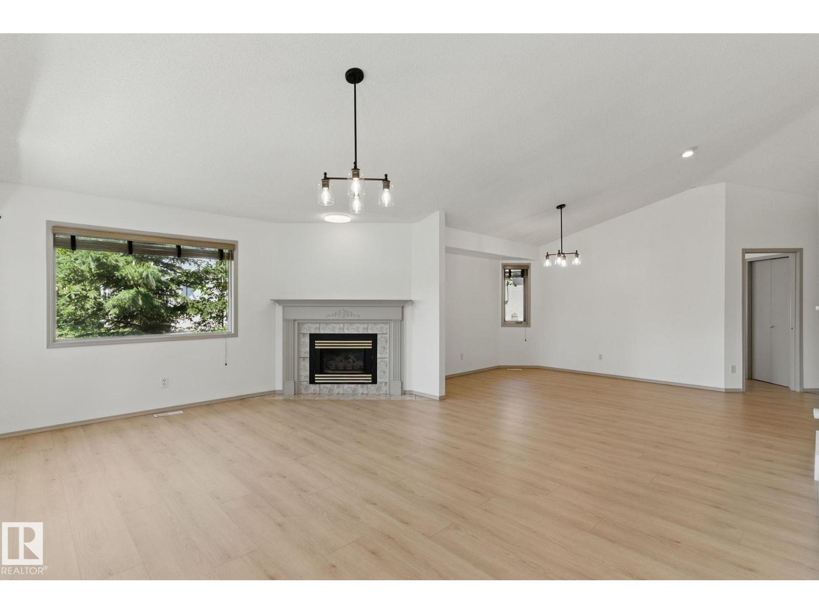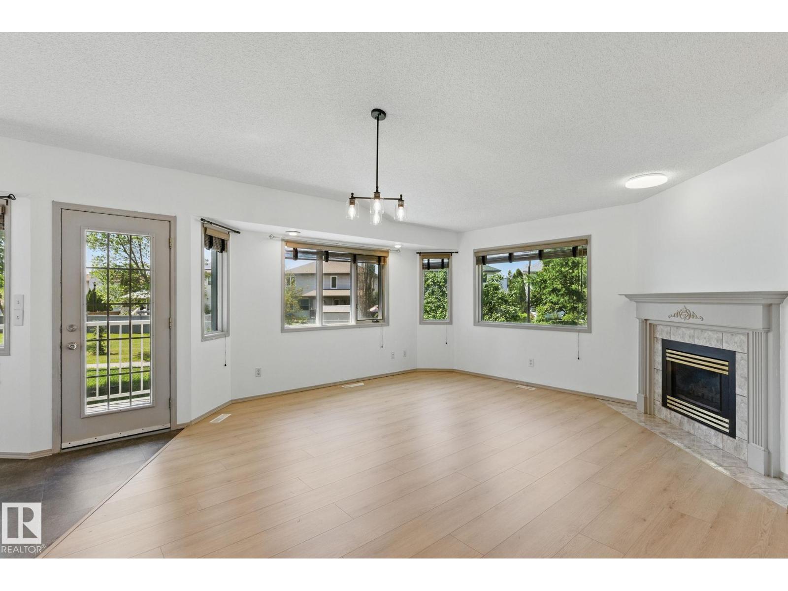 Elegant and spacious 3 bed, 3 bath executive bungalow located on a quiet cul-de-sac backing onto a park. This bright, open-concept home features vaulted ceilings, hardwood and tile flooring, and two gas fireplaces. The large kitchen offers a corner pantry, built-in oven, countertop stove, and garburator. Main floor laundry, central vac, and a deck with views of mature trees add everyday convenience. The fully finished basement includes a 3rd bedroom with walk-in closet, a full bath, family room with wet bar and fridge, games/office space, hobby nook, and ample storage. Double attached garage and no condo fees help keep monthly costs low. Previous owners completed quality upgrades throughout. Walking distance to transit, parks, schools, and close to golf, the Garrison, YMCA, Northgate, Namao Centre, and Hwy 28. A rare opportunity to own a beautifully finished home in a prime location! (id:6769)
