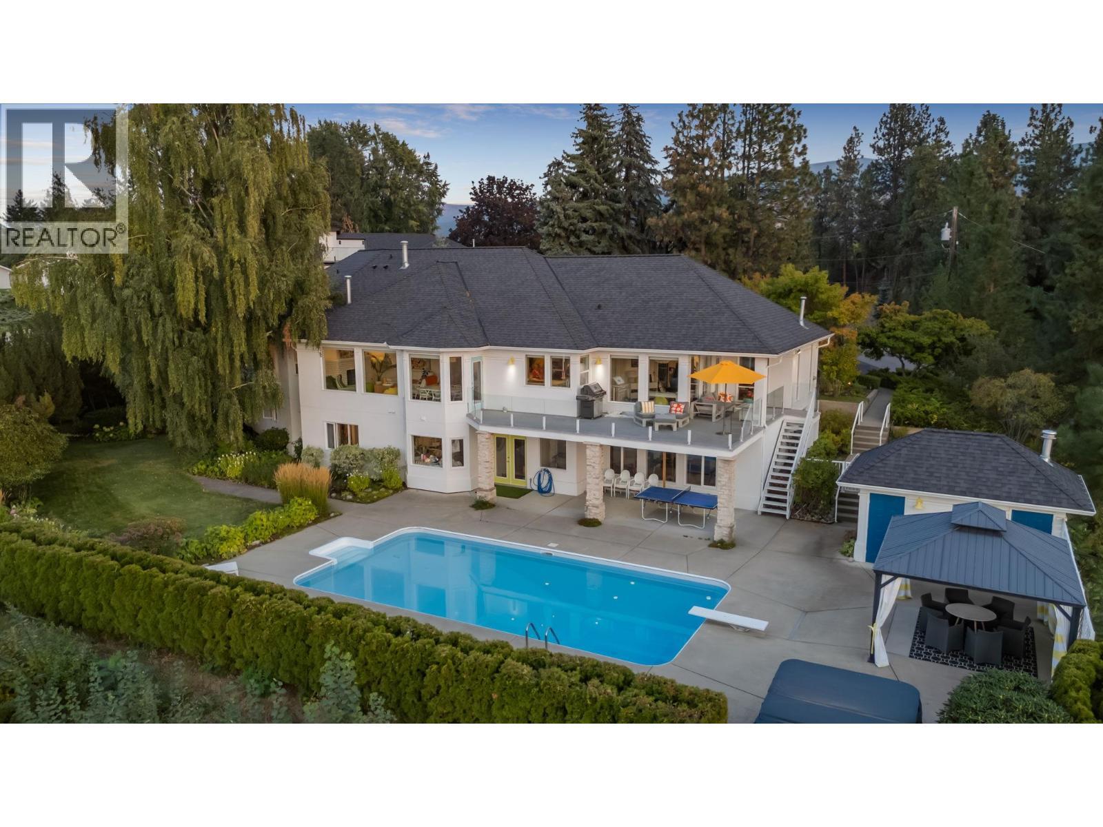 Perched in a serene, private neighborhood, this 2.01 acre, 5-bed, 5-bath rancher with a walkout basement spans 5,306 sq ft and offers the perfect blend of luxury, comfort, and tranquility. Enjoy your morning coffee while taking in breathtaking views of the Kelowna Valley and lake, or unwind beside the firepit as the city lights sparkle below. Bright, airy living spaces and high ceilings create a sense of openness and calm throughout the home. Designed for both entertainment and relaxation, the property features a wired media room, temperature-controlled wine room, hot tub, sauna, pool, firepit, and expansive outdoor living areas. The lush gardens include berry bushes and offer potential for a small orchard, vineyard, or secondary structure under its agricultural A1 zoning. This isn’t just a home—it’s a private sanctuary with unparalleled views, all while being just 10 minutes from Kelowna’s city centre. (id:6769)