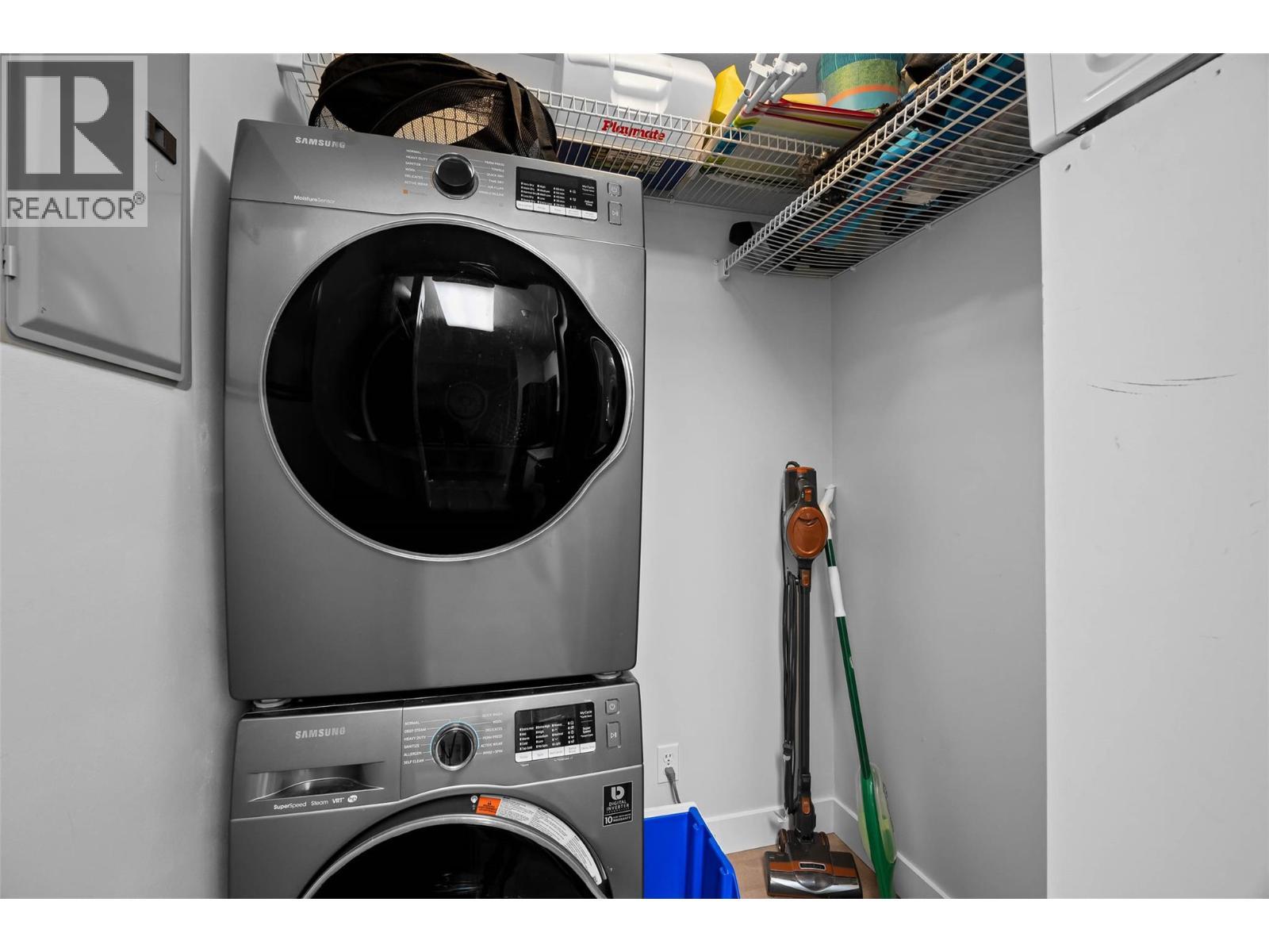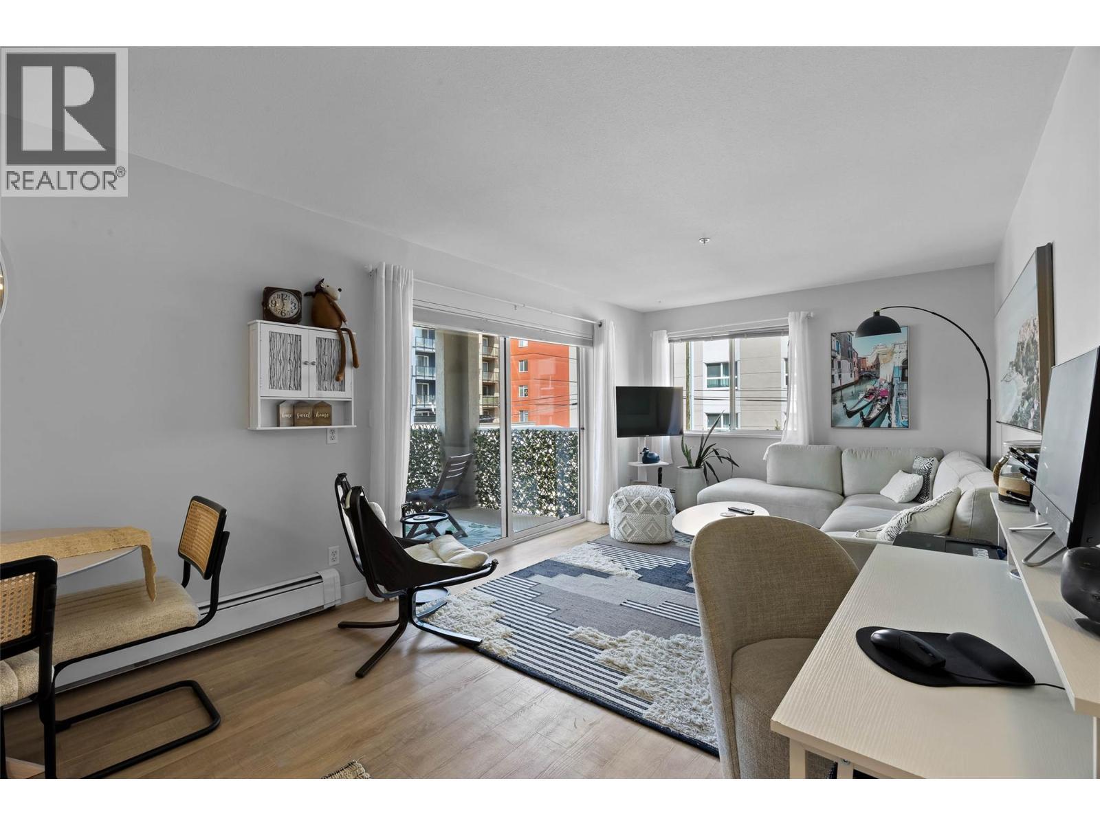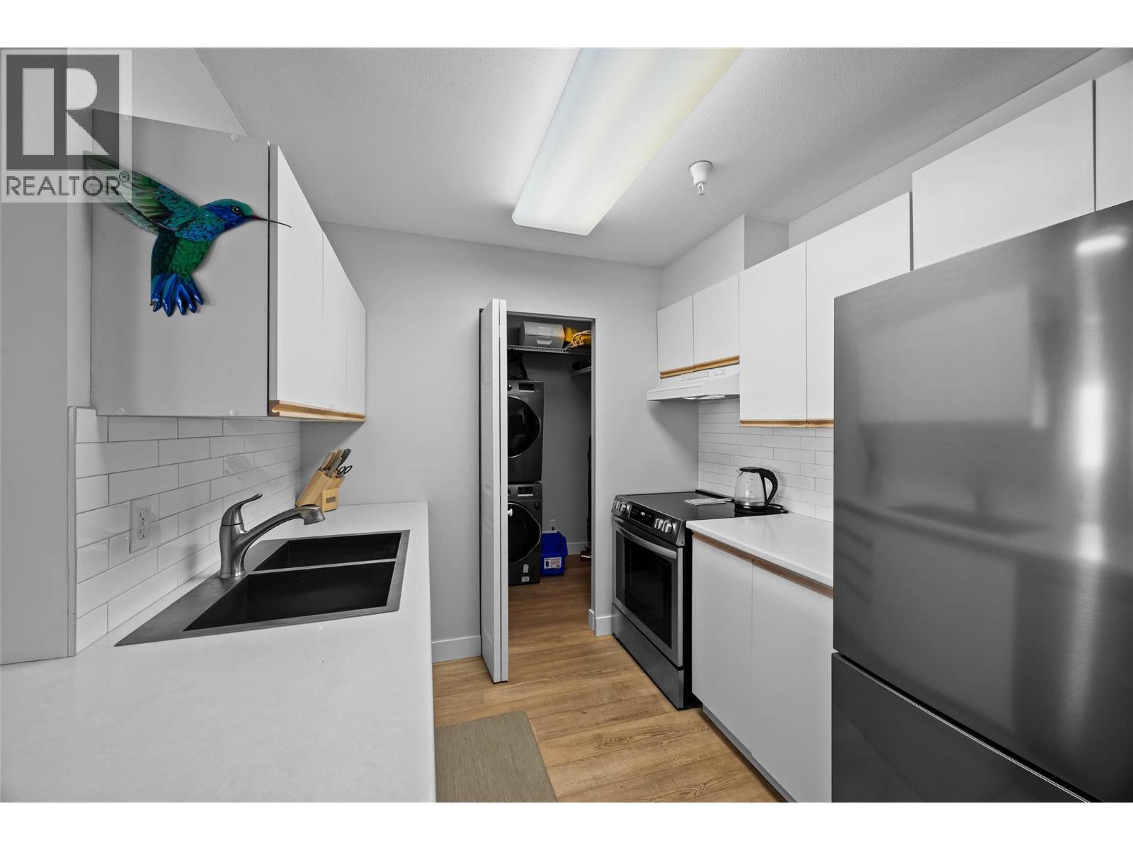 Bright & open 1 bed, 1bath corner unit in 55+ downtown building. Recent upgrades: kitchen countertops, backsplash, modern deep double sink & faucet. All new, quality stainless steel appliances and functional storage area by kitchen with stacked washer and dryer. Fresh paint including ceilings and baseboards, laminate flooring, built-in bedroom cabinets and a large west-facing deck to enjoy the elements. Short walking distance to the farmer's market, RIH, YMCA, riverside park, library and shopping. This welcoming community-oriented, non-smoking complex offers a shared amenities room with library, low strata fees and underground parking. Pets allowed with restrictions. A great location and lifestyle opportunity awaits. Come and see! (id:6769)