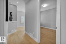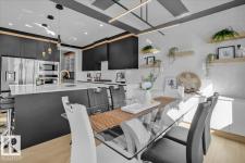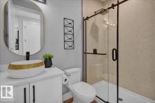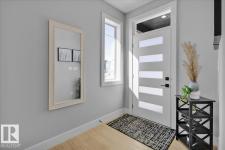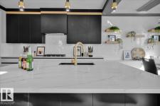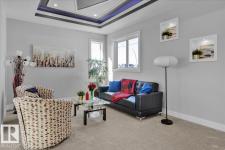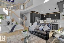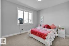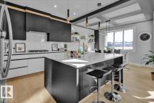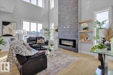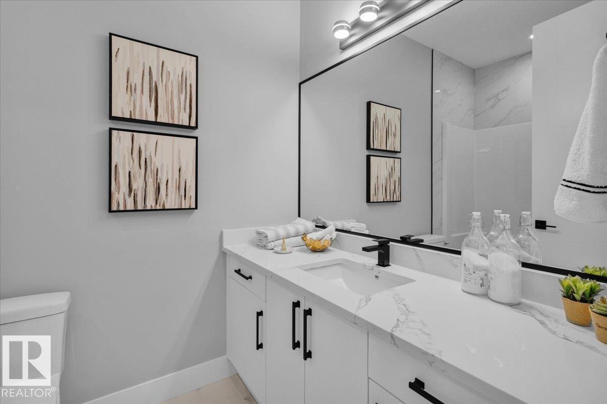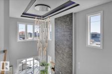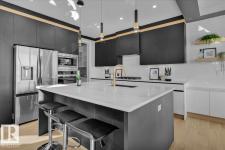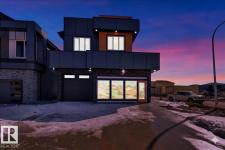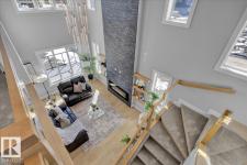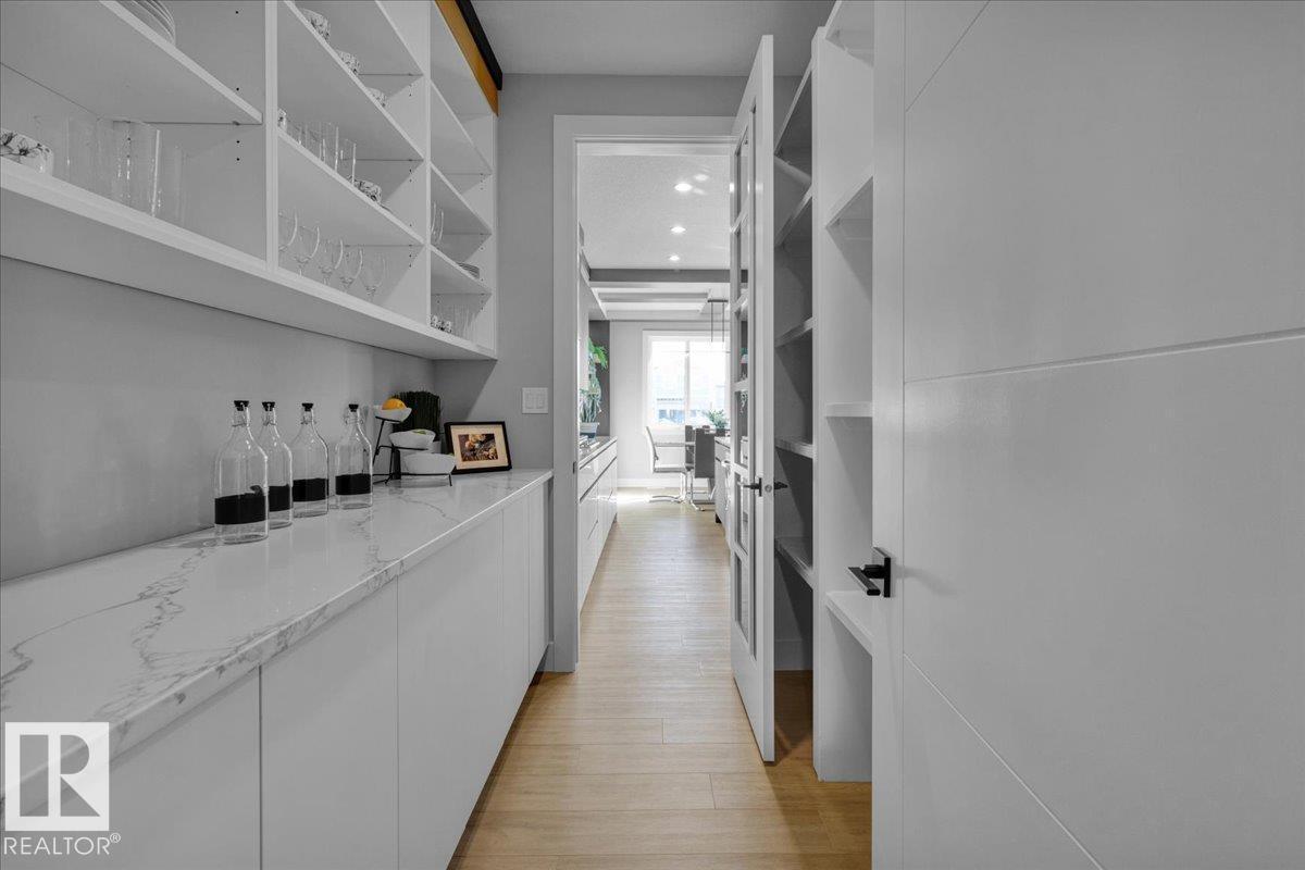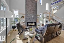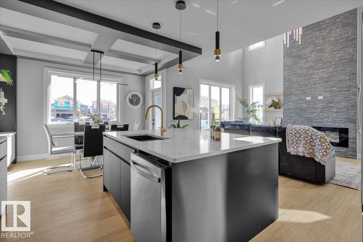 Current show home loaded with upgrades & fully landscaped. Striking modern exterior with bold charcoal & warm wood-tone accents. Heated triple attached garage — drywalled & painted — with a 16ft×8ft double door & 8ft×10ft single door, ideal for trucks & oversized vehicles. Main floor offers a spacious mudroom with custom built-ins, walk-in pantry with quartz countertop & full shelving, and a gourmet kitchen with dark charcoal cabinetry, quartz island & pendant lighting. The great room stuns with open-to-above ceilings, full-height stone tile feature wall, linear fireplace & LED built-ins. Main floor den/bedroom + 3pc bath. Central A/C included. Upstairs: bonus room, primary suite with coffered ceiling, LED accents, barn door ensuite & walk-in closet, walk-through laundry, 3 more bedrooms & full bath. Fully finished basement with rec room, wet bar, bedroom & full bath. Quality & style in every room. (id:6769)