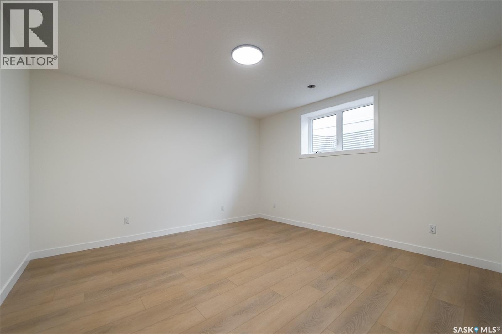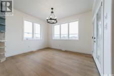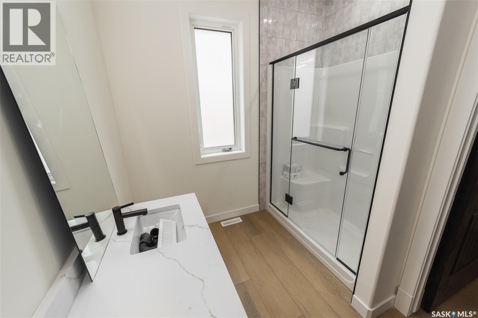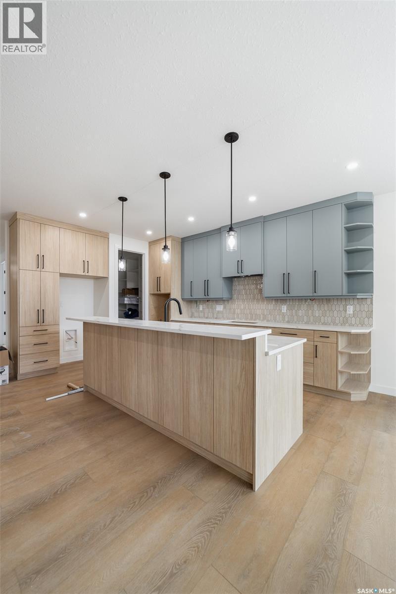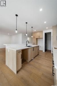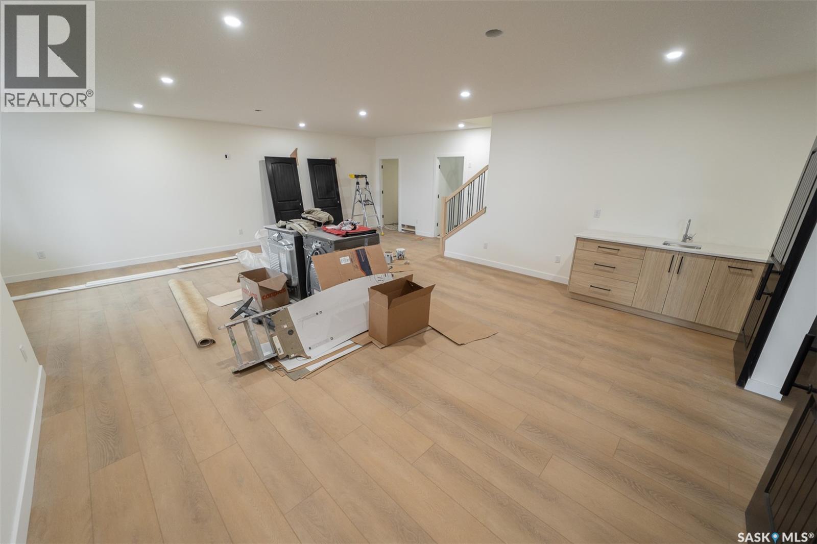 Welcome to this beautiful 1704 sqft custom built home backing green space. Walking and biking paths are at the back of the house and situated only a block away from the new White City School. Home features lots of oversized windows for natural light and has 8-foot-tall interior doors. Features include modern, custom installed hand railing staircase opened to the lower level, a luxurious kitchen with two tone cabinetry and a convenient 9 feet 2 level eat-in island, quartz countertops complemented with ceramic tiled backsplash and an oversized walk-in pantry with lots of storage. The main floor boasts 2 large bedrooms, a main bathroom, large office (that can be used as a bedroom), ensuite bathroom with a makeup station, walk-in closets, large cozy living room with LVP flooring, modern linear gas fireplace, stainless steel appliances in the kitchen. It also has an amazing covered 15'-0" x 12-0" balcony with a French door, waterproof membrane, and a gas BBQ connection. Lower level is fully developed with LVP flooring throughout, spacious recreational room, 2 large bedrooms with a walk-in closet in each bedroom, wet bar, 4pc bath, large laundry room with cabinets and appliances, high efficiency furnace, owned on demand water heater, air conditioning, and air to air. The oversized 3 car garage with 12' ceiling is insulated, boarded, and primed adding both functionality and curb appeal, garage heater, grit interceptor connected to the house drain and black garage doors with glass inserts. The outside of the house is finished with wood grain metal and acrylic stucco. There are also permanent Christmas Gemstone lights built in and included. Some details still need to be finished in the house, seasonal work including any concrete work, driveways etc will be done pending weather conditions. (id:6769)
