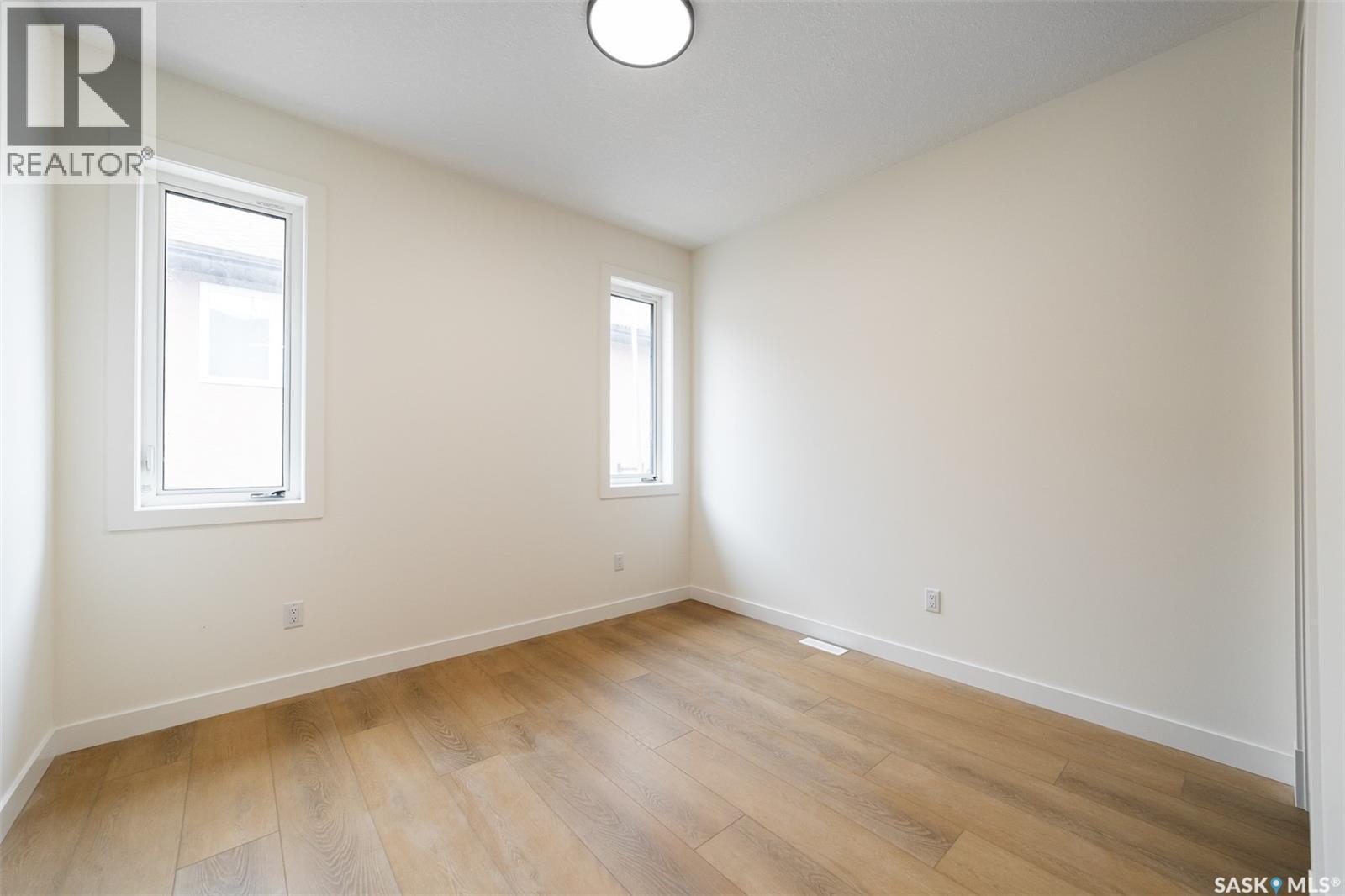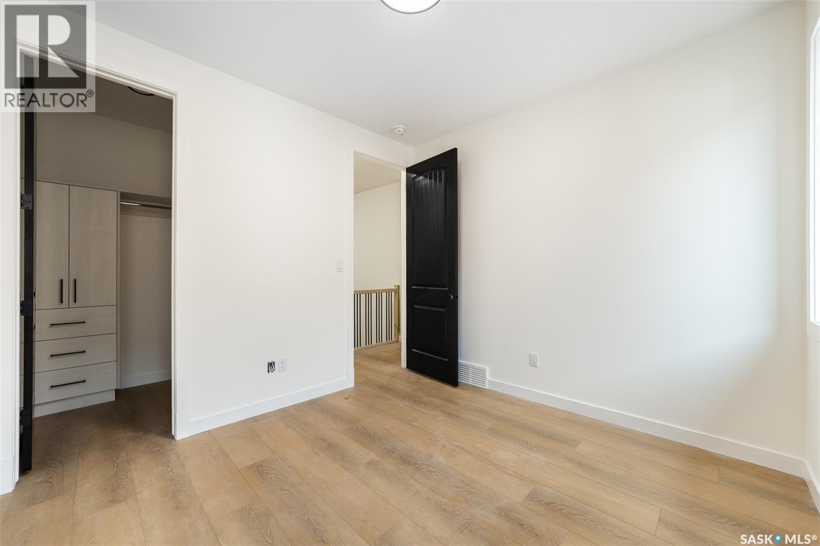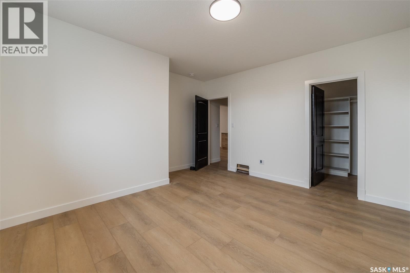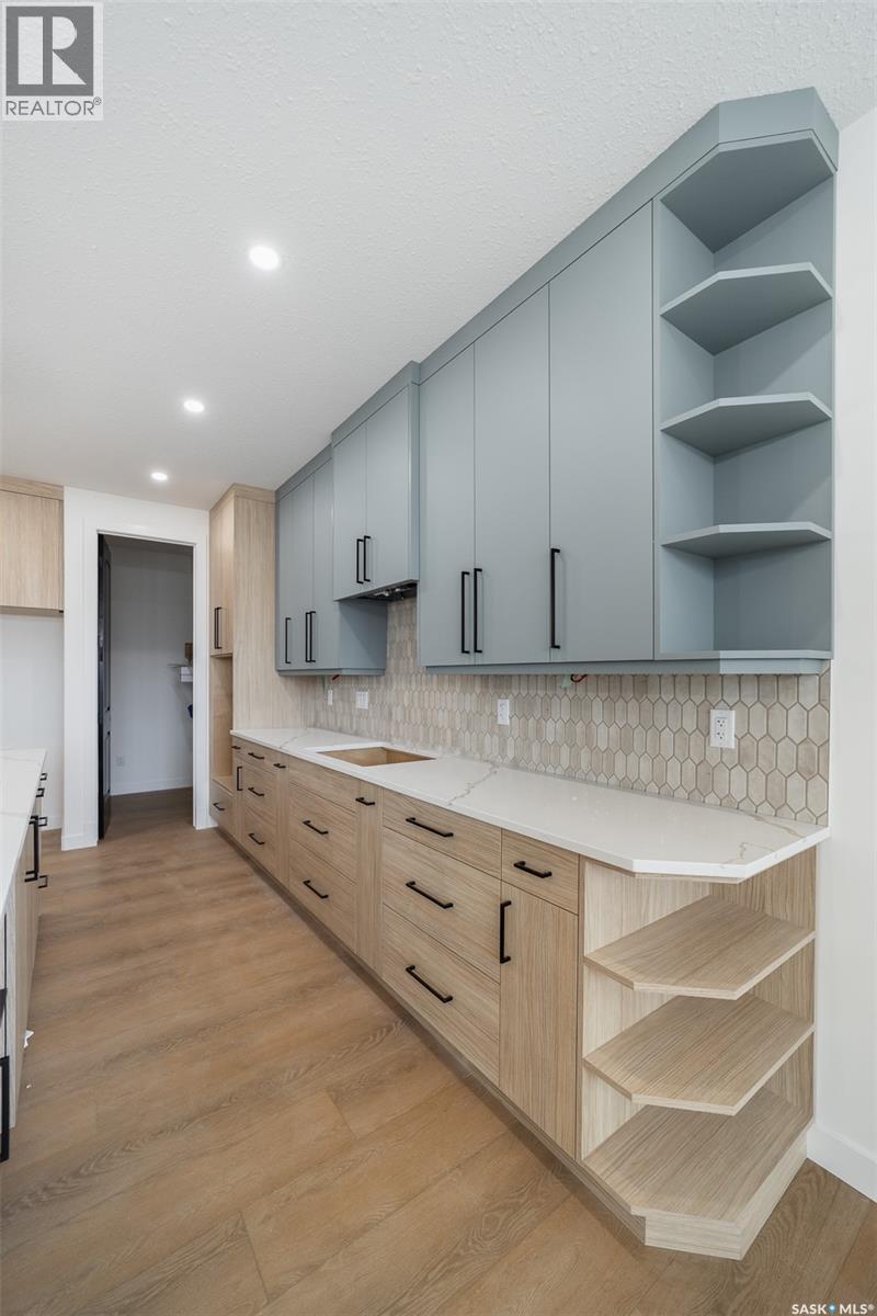 Welcome to this beautiful 1704 sqft custom built home backing green space. Walking and biking paths are at the back of the house and situated only a block away from the new White City School. Home features lots of oversized windows for natural light and has 8-foot-tall interior doors. Features include modern, custom installed hand railing staircase opened to the lower level, a luxurious kitchen with two tone cabinetry and a convenient 9 feet 2 level eat-in island, quartz countertops complemented with ceramic tiled backsplash and an oversized walk-in pantry with lots of storage. The main floor boasts 2 large bedrooms, a main bathroom, large office (that can be used as a bedroom), ensuite bathroom with a makeup station, walk-in closets, large cozy living room with LVP flooring, modern linear gas fireplace, stainless steel appliances in the kitchen. It also has an amazing covered 15'-0" x 12-0" balcony with a French door, waterproof membrane, and a gas BBQ connection. Lower level is fully developed with LVP flooring throughout, spacious recreational room, 2 large bedrooms with a walk-in closet in each bedroom, wet bar, 4pc bath, large laundry room with cabinets and appliances, high efficiency furnace, owned on demand water heater, air conditioning, and air to air. The oversized 3 car garage with 12' ceiling is insulated, boarded, and primed adding both functionality and curb appeal, garage heater, grit interceptor connected to the house drain and black garage doors with glass inserts. The outside of the house is finished with wood grain metal and acrylic stucco. There are also permanent Christmas Gemstone lights built in and included. Some details still need to be finished in the house, seasonal work including any concrete work, driveways etc will be done pending weather conditions. (id:6769)