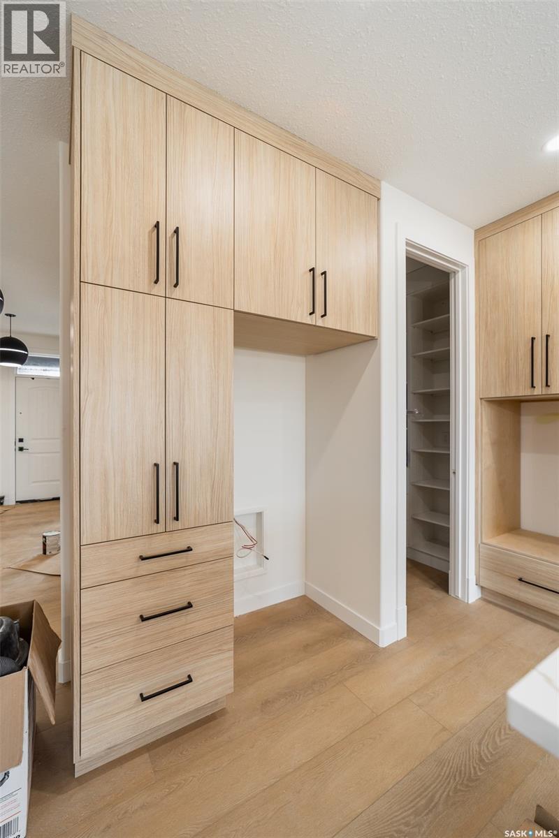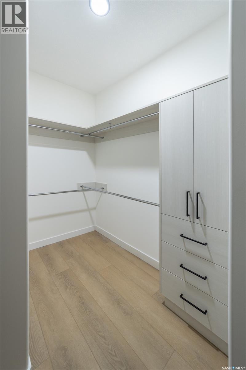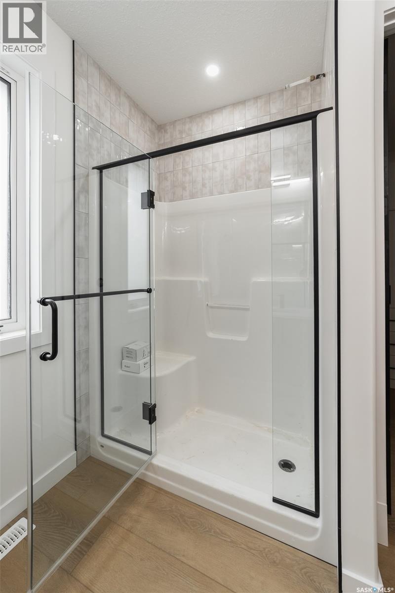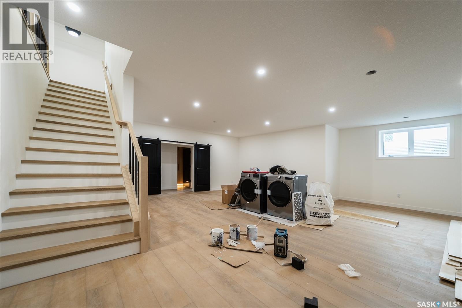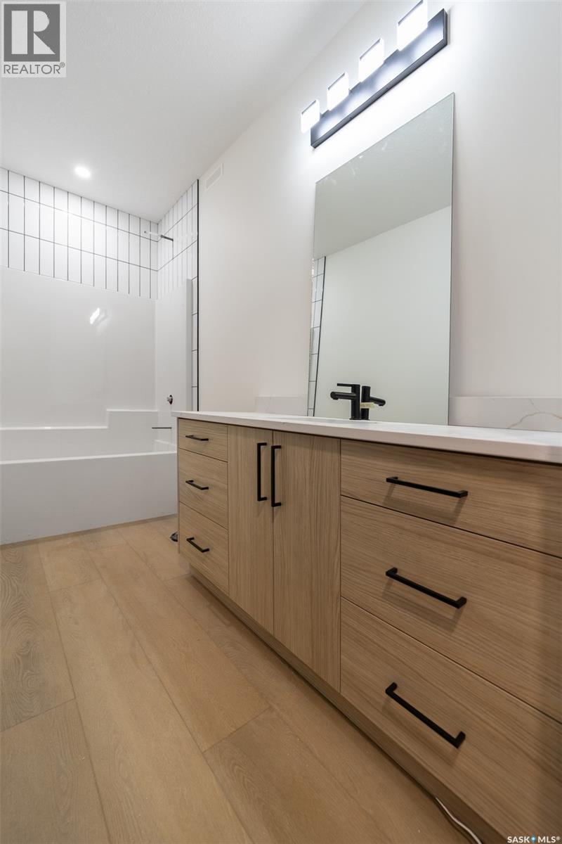 Welcome to this beautiful 1704 sqft custom built home backing green space. Walking and biking paths are at the back of the house and situated only a block away from the new White City School. Home features lots of oversized windows for natural light and has 8-foot-tall interior doors. Features include modern, custom installed hand railing staircase opened to the lower level, a luxurious kitchen with two tone cabinetry and a convenient 9 feet 2 level eat-in island, quartz countertops complemented with ceramic tiled backsplash and an oversized walk-in pantry with lots of storage. The main floor boasts 2 large bedrooms, a main bathroom, large office (that can be used as a bedroom), ensuite bathroom with a makeup station, walk-in closets, large cozy living room with LVP flooring, modern linear gas fireplace, stainless steel appliances in the kitchen. It also has an amazing covered 15'-0" x 12-0" balcony with a French door, waterproof membrane, and a gas BBQ connection. Lower level is fully developed with LVP flooring throughout, spacious recreational room, 2 large bedrooms with a walk-in closet in each bedroom, wet bar, 4pc bath, large laundry room with cabinets and appliances, high efficiency furnace, owned on demand water heater, air conditioning, and air to air. The oversized 3 car garage with 12' ceiling is insulated, boarded, and primed adding both functionality and curb appeal, garage heater, grit interceptor connected to the house drain and black garage doors with glass inserts. The outside of the house is finished with wood grain metal and acrylic stucco. There are also permanent Christmas Gemstone lights built in and included. Some details still need to be finished in the house, seasonal work including any concrete work, driveways etc will be done pending weather conditions. (id:6769)