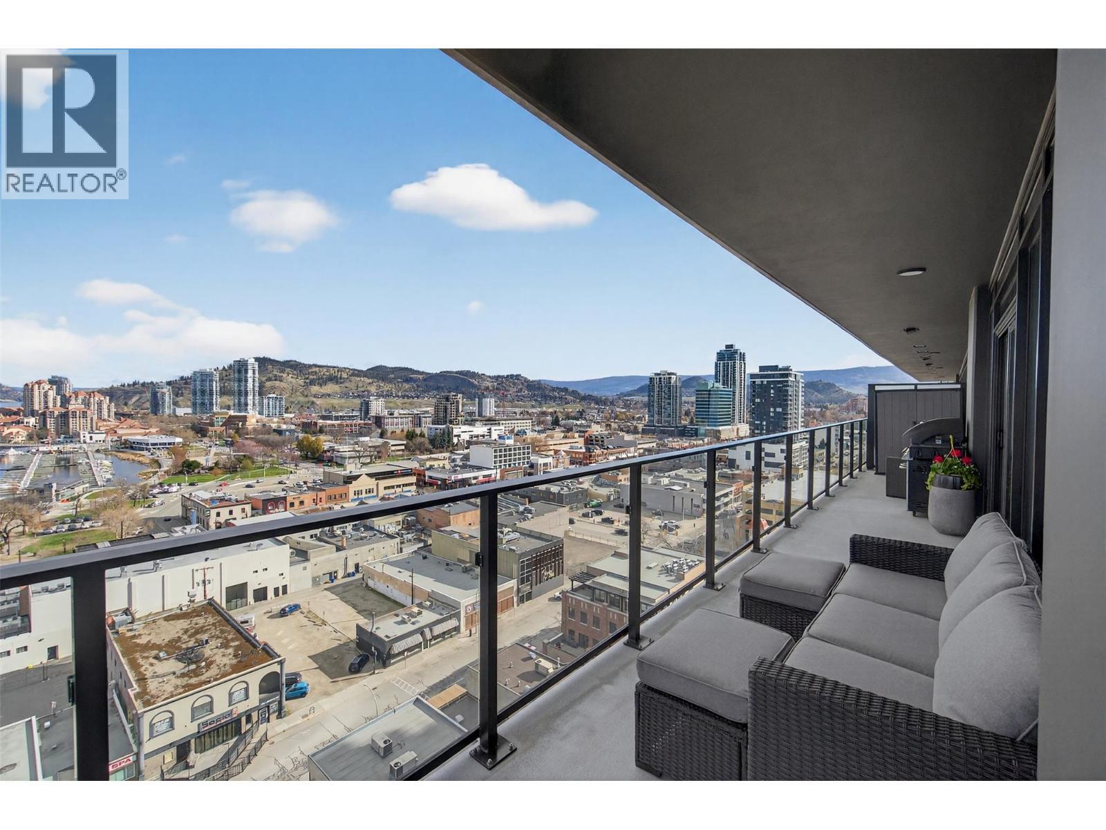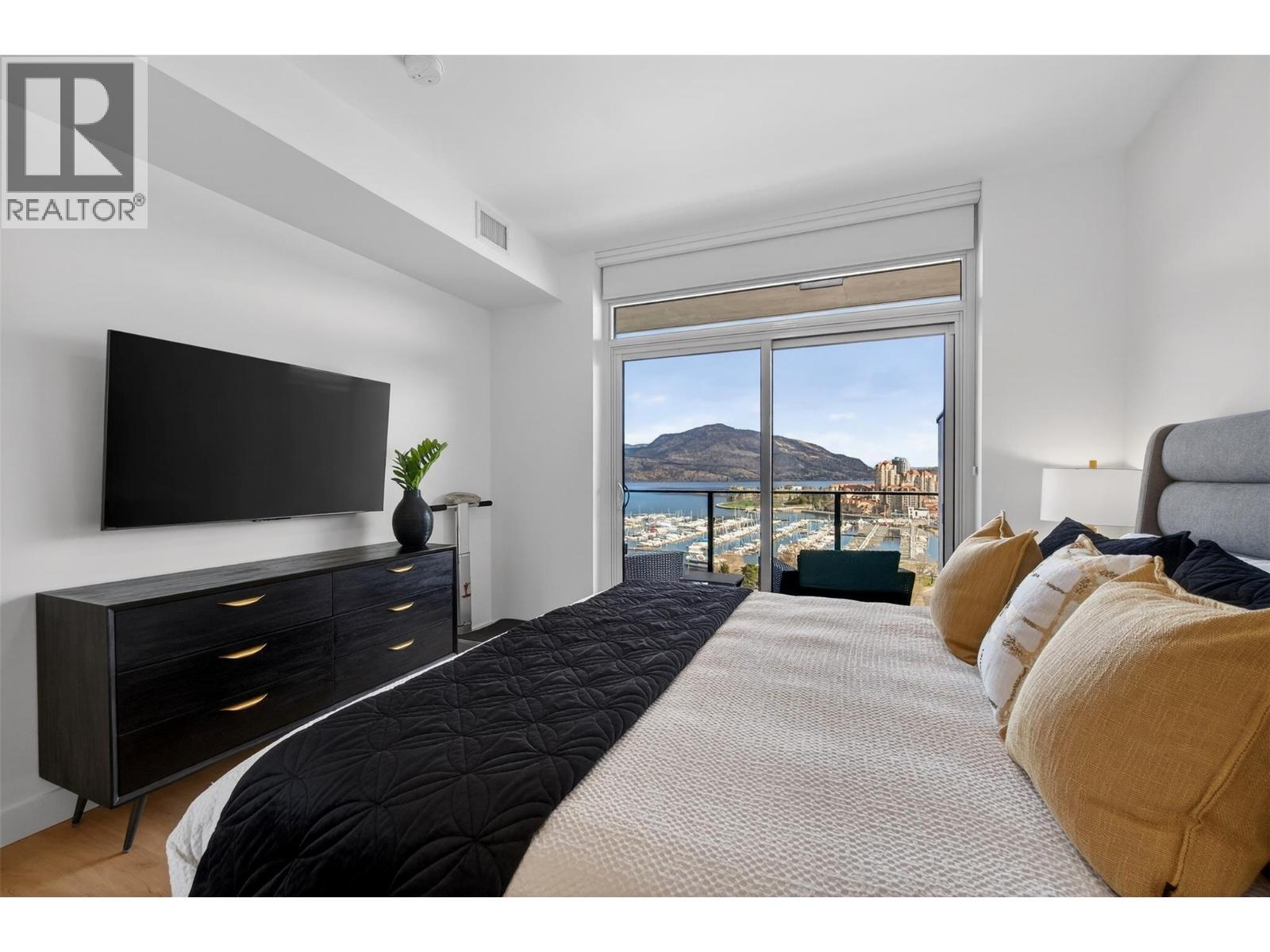 Stunning 2025, 3 bedroom + den condo in the heart of downtown Kelowna. This is a large corner unit with breathtaking views of Okanagan Lake, City Park, Kelowna Yacht Club, Bennett Bridge, as well as sparkling city lights on both sides of the lake. This unit is located on the quiet side of the building (NW corner) and has an excellent split-plan layout & has lots of upgrades which include beverage center, entertainment center, closet & storage improvements, etc. It also has a panoramic wraparound balcony, c/w natural gas BBQ hookup. All rooms have spectacular views; currently, the 2nd bedroom is set up as a guest room, the 3rd bedroom is set up as an office with its own private balcony & the den is set up as an additional bedroom-lots of flexibility with basically 4 bedrooms. The living room features a built-in 75"" TV & 72"" electric fireplace. Resort-like amenities include large outdoor pool, hot-tubs, games room, golf simulator, putting green, sauna, steam, party rms & more. This is an exceptional condo and the location is 2nd to none - short walk to shops, restaurants, Safeway, coffee shops, lakefront boardwalk, water sports rental facilities, the community theater, Prospera Place & City Park which gives immediate access to tennis courts, lovely beach, walking & bike trails, dog park & more. Includes 2 side-by-side, heated, indoor parking stalls in a premium location & a storage locker. Additional storage capacity is provided with 2 large deck boxes. Turnkey option available (id:6769)