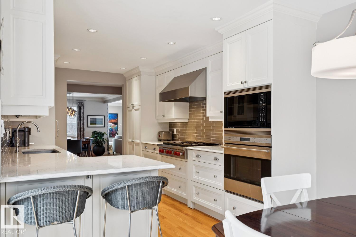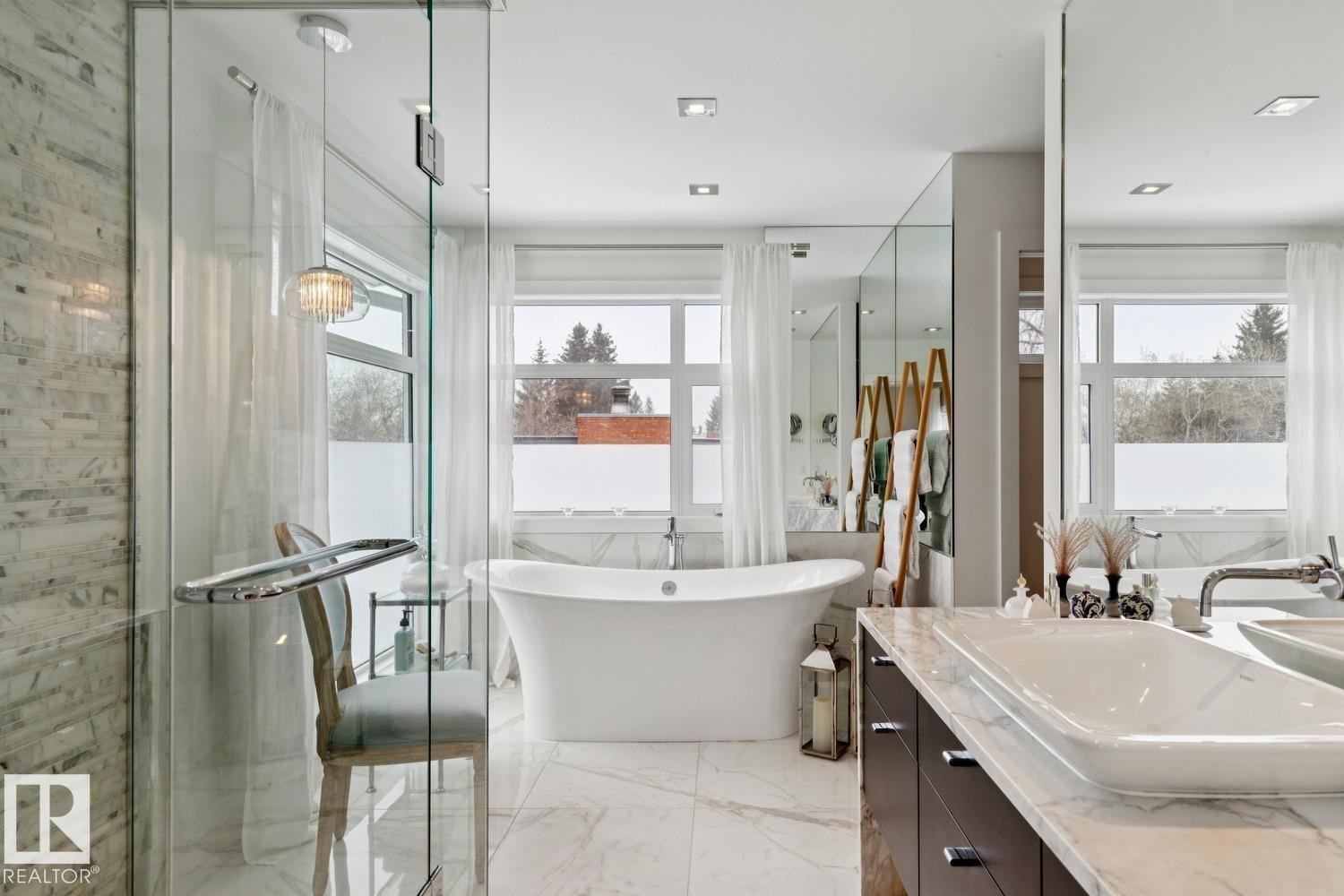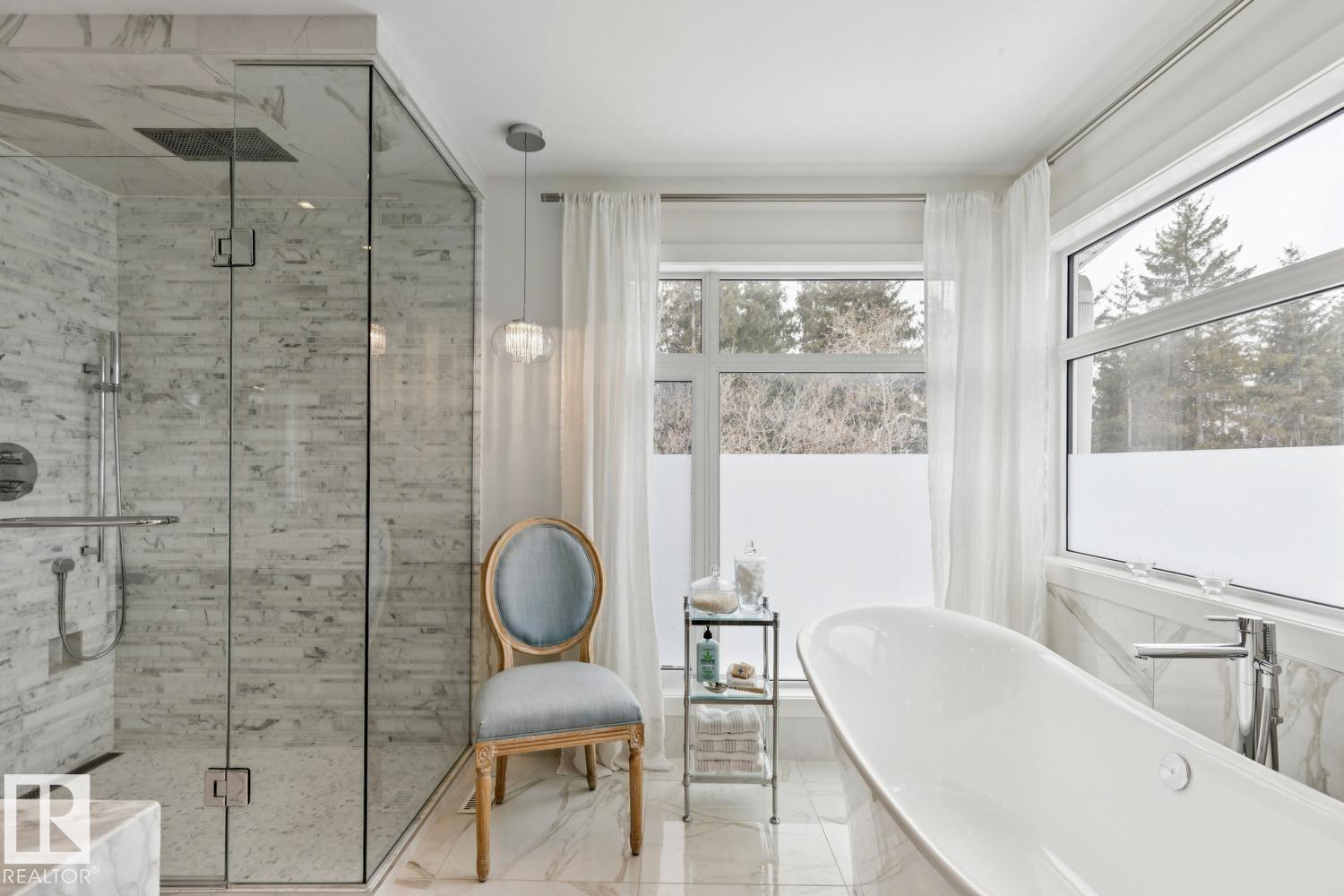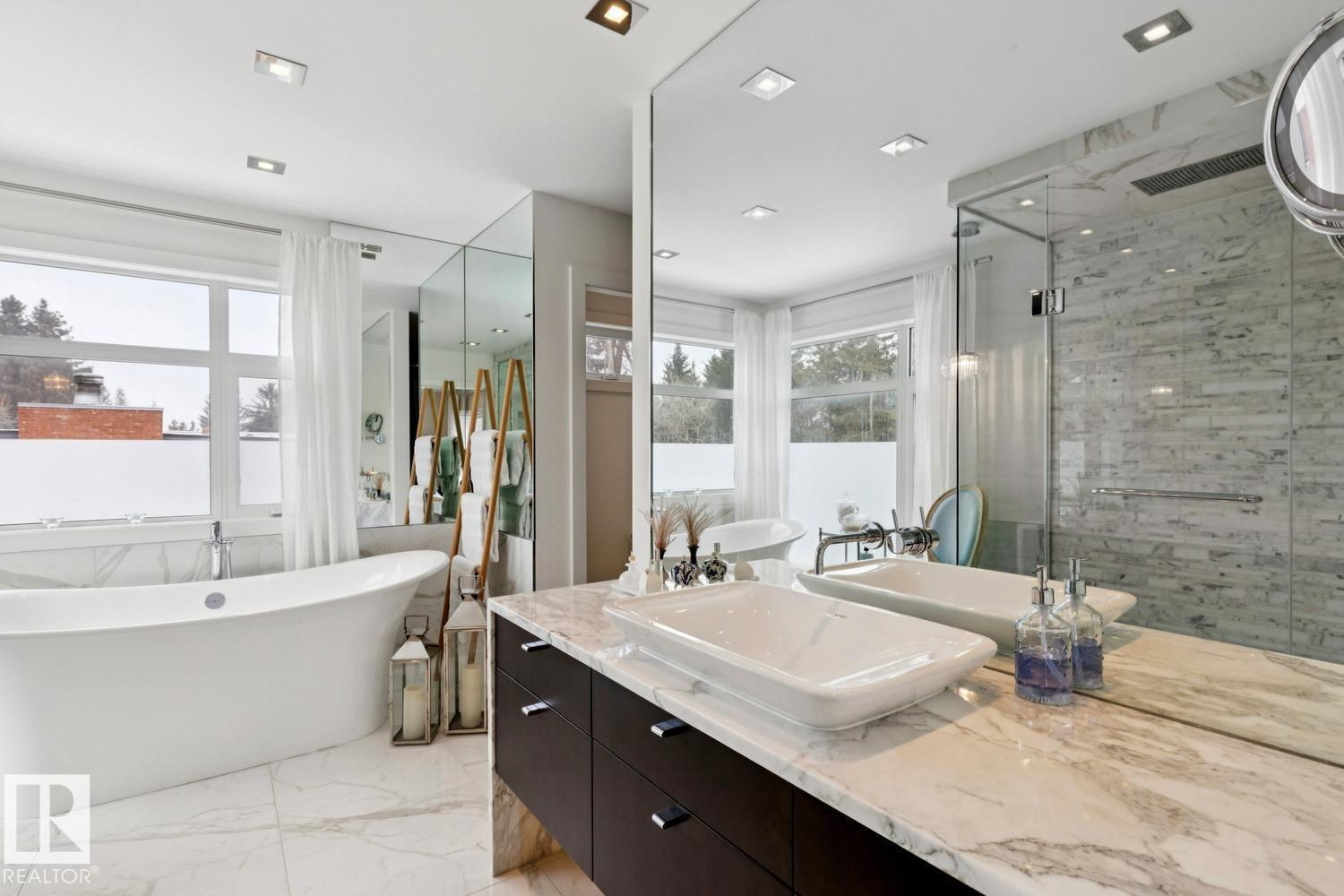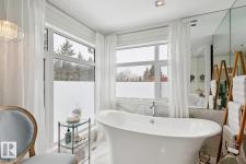 Absolutely breathtaking in prestigious Westbrook Estates! Backing directly onto Whitemud Creek Ravine, this stunning home has undergone a spectacular renovation and is truly one of a kind! Sitting upon a very secluded 12,500+ sqft lot, and offering close to 3300 sqft of living space, this gorgeous revitalization will certainly impress. The main floor features a lavish kitchen w/quartz counters, premium cabinetry, and high-end appliances. Gorgeous living area w/floor to ceiling windows, hardwood floors, and stunning gas fireplace, adjacent to the formal dining area. Upstairs you will find the primary suite w/spa-like ensuite, walk-in closet, and balcony that overlooks the beautiful yard, 2nd bedroom, and additional 3-pc bath/laundry room. The lower levels offer walkout access, a magnificent living room w/stone fireplace, cozy home theatre area, rec room, 2 additional bedrooms, additional 3-pc bath, and plenty of storage space. Spectacular home located in one of Edmonton's most sought-after neighbourhoods! (id:6769)