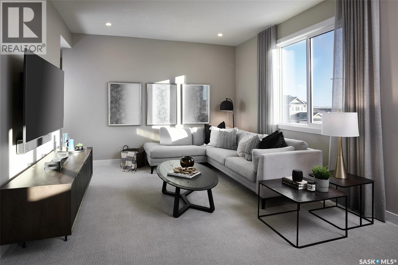 Note: This home is currently under construction and the photos provided are for REFERENCE only, some are virtual renderings and some colors may vary. Welcome to the Arnica. This stunning 2-storey home, offering 2,218 sq. ft., is a brand-new build by Laurel Homes located in the up and coming Royal Park subdivision of White City. This home showcases a modern dark-palette design paired with elevated interior selections throughout. The main floor features an open-concept layout with a stylish kitchen complete with flat-slab cabinetry, marble-quartz countertops, a walk-in pantry, matte-black fixtures, and included appliances: fridge, stove, microwave hood fan, and built-in dishwasher. The great room is anchored by a sleek, contemporary fireplace, while the dining area provides direct access to the rear deck complied of composite decking. A 2-pc bathroom and a versatile den—complete the main level. Upstairs, a spacious bonus room separates the secondary bedrooms from the serene primary suite, which includes a walk-in closet and a beautifully appointed 5-pc ensuite with quartz counters, a stand up shower, and matte-black fixtures. A convenient upper-floor laundry room and an additional 4-pc bathroom complete the 2nd level. The basement is unfinished, equipped with a sump pump and roughed-in bathroom plumbing—ready for future development. Optional basement development by the builder is available at an additional cost. More great features include laminate/LVT flooring in most spaces, black hardware throughout, Grey interior paint, and a fully insulated and drywalled double attached garage and fully installed central air conditioning! Thoughtfully designed and highly elevated, this home blends modern style with everyday functionality. Possession estimated: July 1, 2026. Asking price includes GST and PST. PST is remitted to the builder. GST rebate, if applicable, goes to the builder. First-Time Home Buyer GST rebate goes to the purchaser as a reduction of the purchase price. (id:6769)