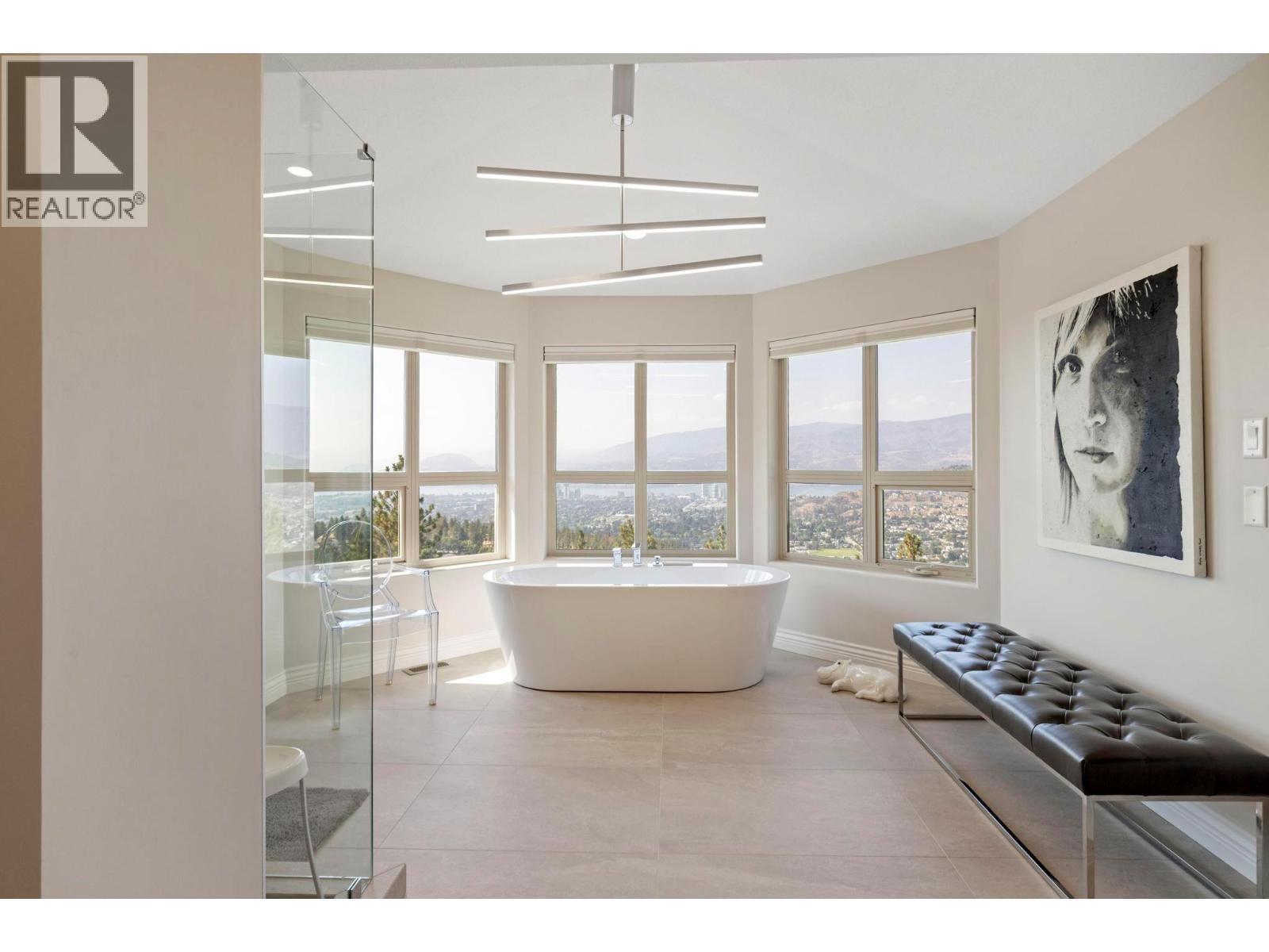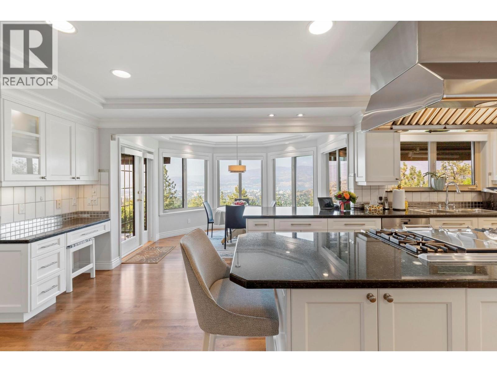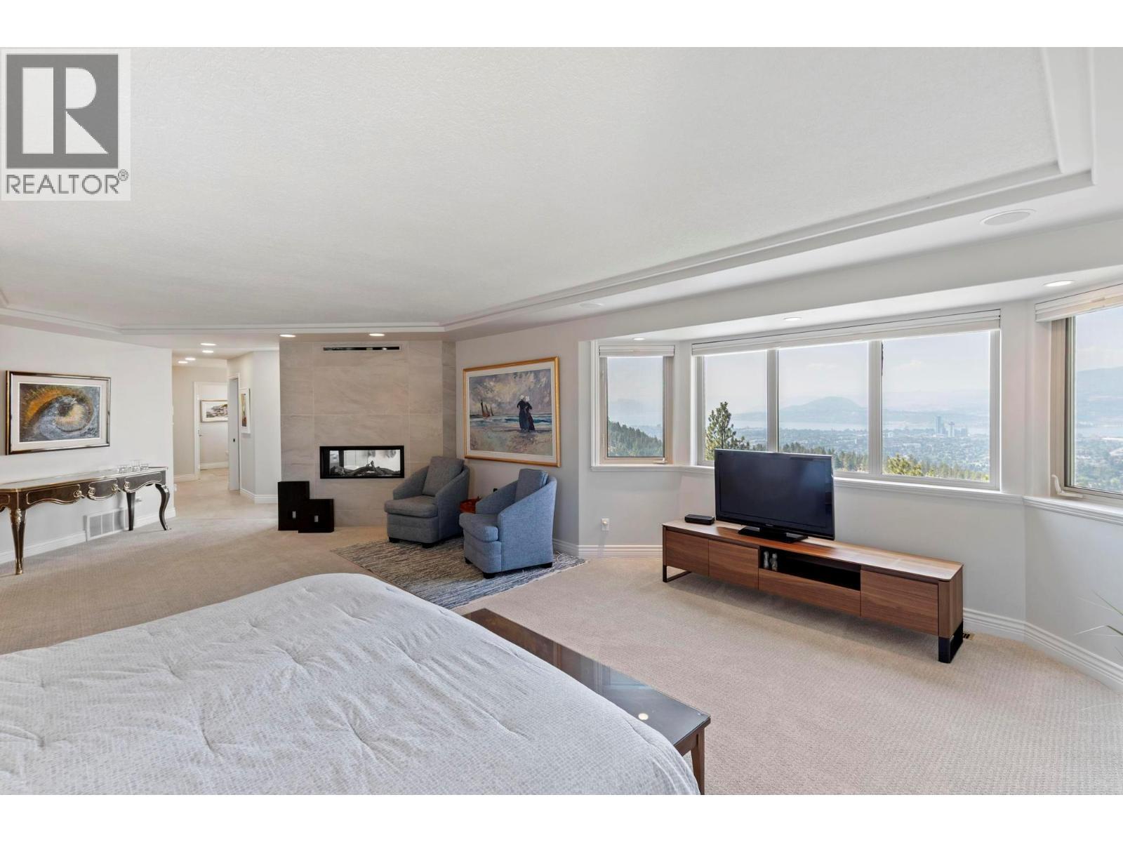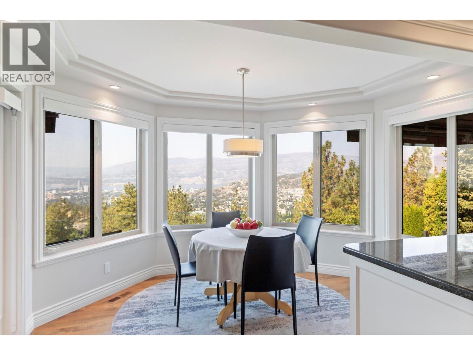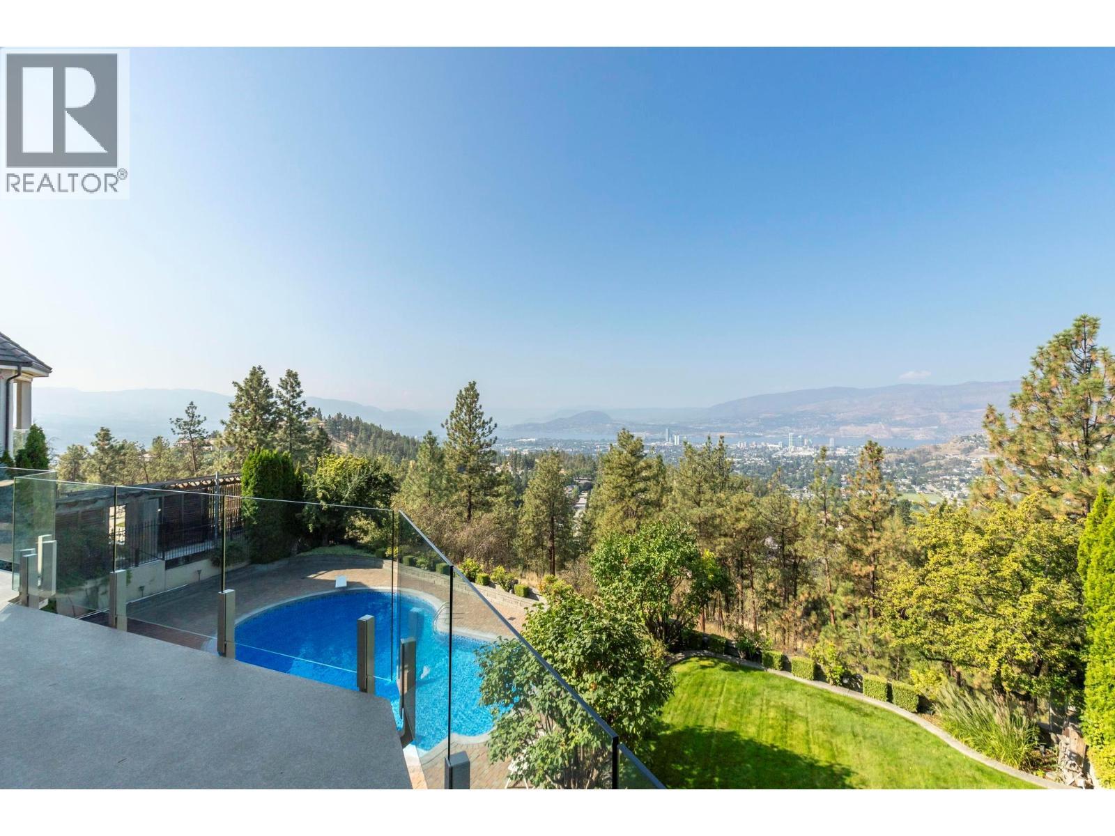 Prestige, scale, and breathtaking views define this custom-built estate on one of Kelowna’s most coveted streets atop Dilworth Mountain. Originally built as the builder’s dream home, every detail reflects quality and timeless design. With over 6,300 sq. ft., 6 bedrooms plus a den, and 5 bathrooms, this residence showcases exceptional craftsmanship with tray and coffered ceilings, crown moldings, and superior finishes. The main level welcomes with a stone-floored foyer and curved staircase, leading to a vaulted living room with a double-sided fireplace, an elegant dining room, and a chef’s kitchen featuring granite counters, Viking range, Sub-Zero/Miele refrigeration, and a bright breakfast nook with lake views. A family room, private office, powder room, and seamless walkout to covered decks complete the floor. Upstairs, four spacious bedrooms include a luxury 1,050+ sq. ft. primary retreat with incredible views, sitting area with fireplace, dual walk-in closets, and a spa-inspired ensuite with soaker tub. The lower floor boasts 11-ft ceilings, a recreation room with wet bar, additional beds and baths, and a separate entrance with suite potential. Outdoor living includes a pool with brick surround, built-in hot tub, expansive decks for entertaining, spectacular sunsets, and manicured grounds with sweeping lake views. A gorgeous brick-paved driveway leads to the heated garage. Homes on this stretch of Skeena Drive rarely come to market, a once-in-a-lifetime estate opportunity! (id:6769)
