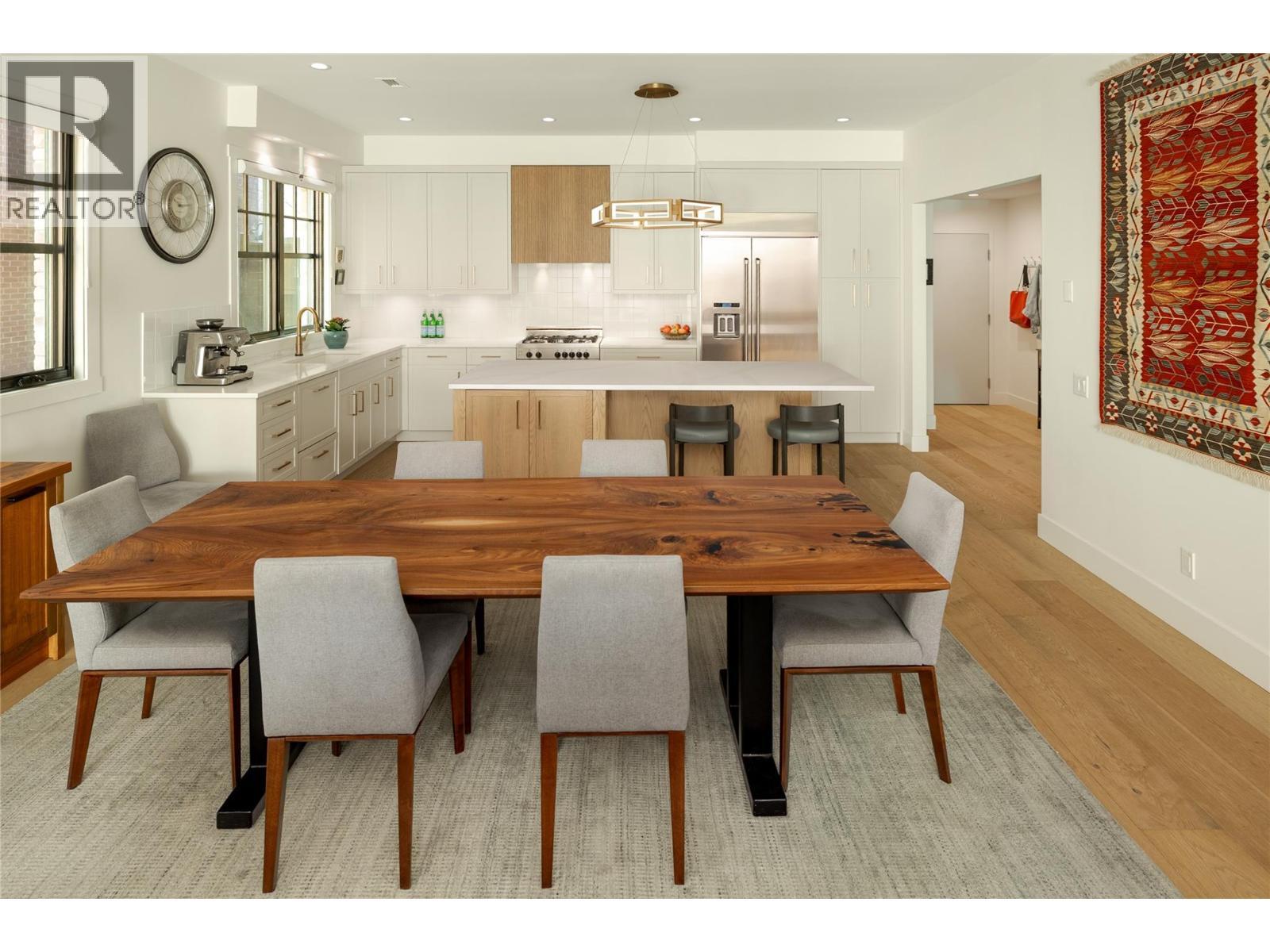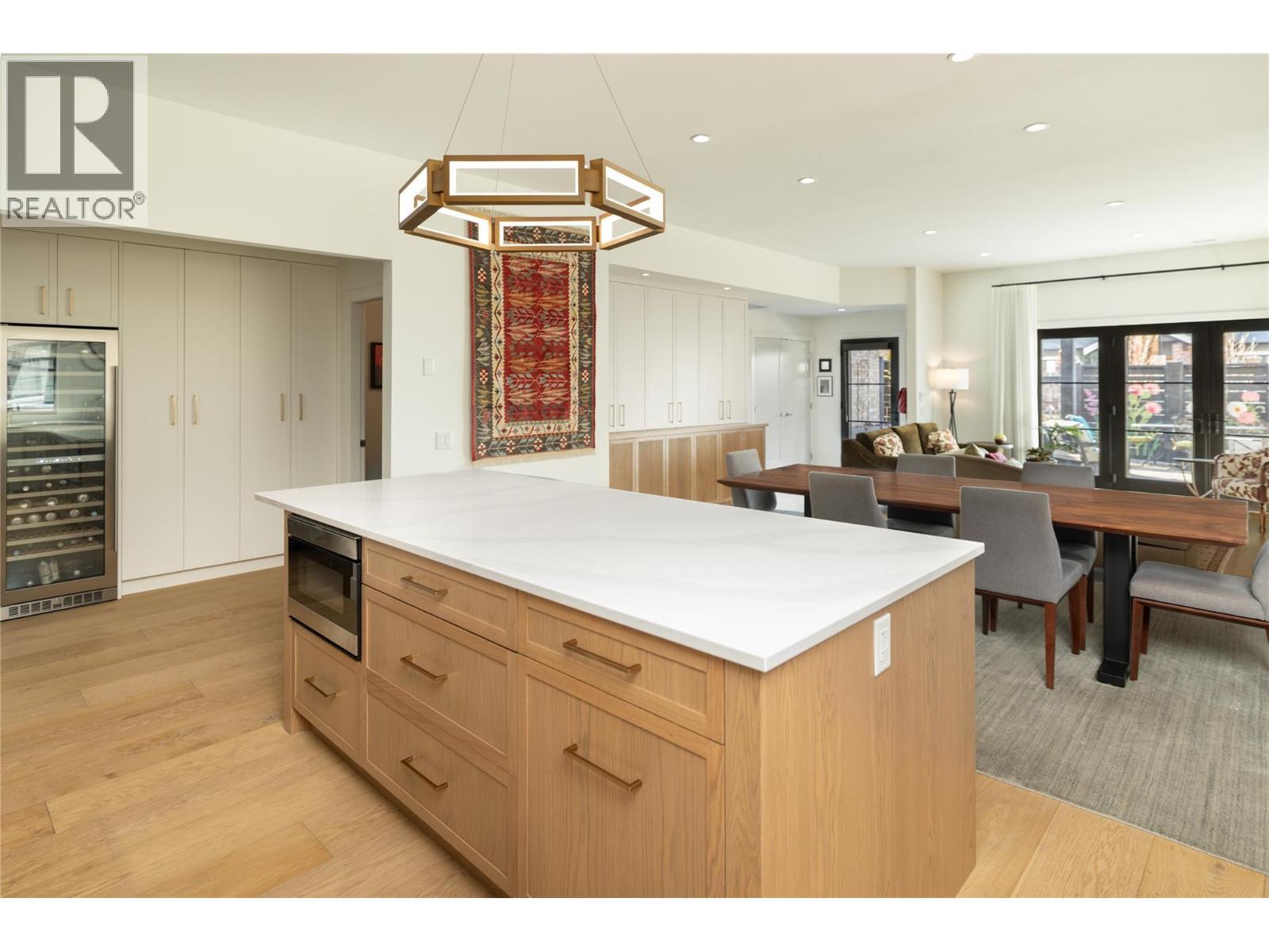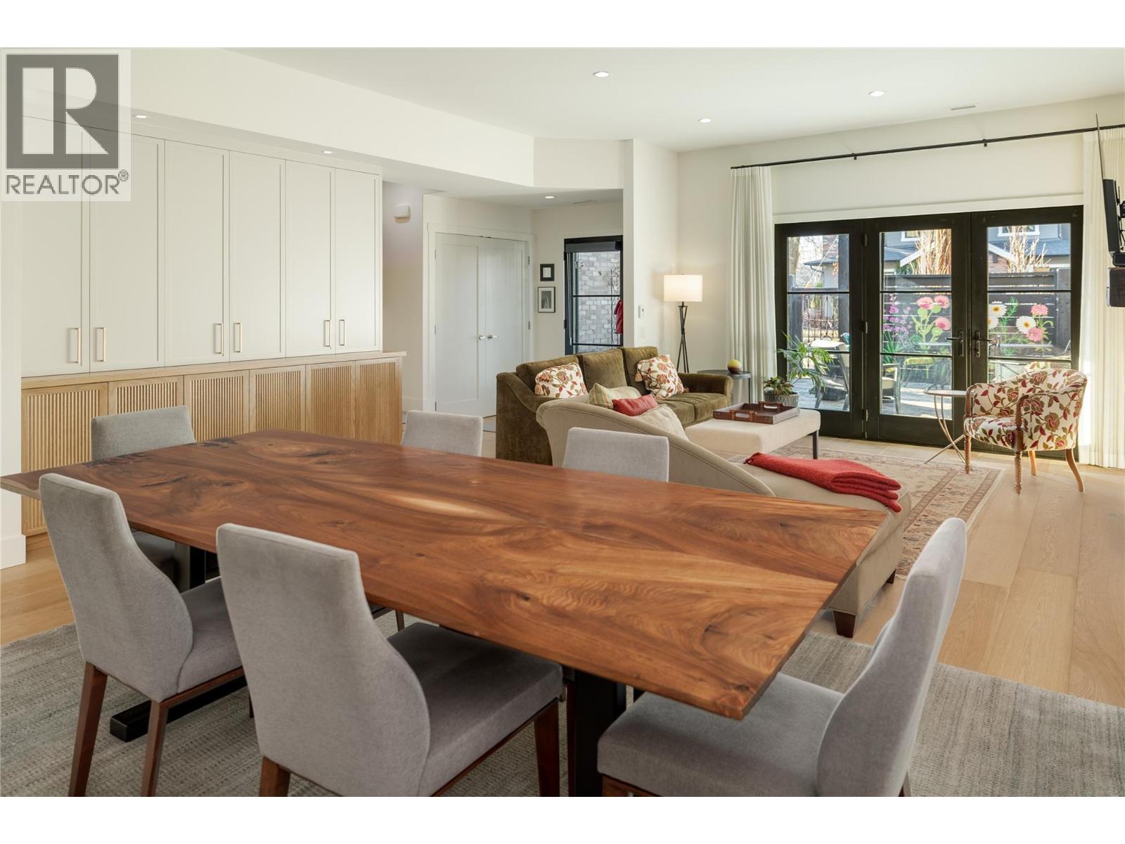 Life here unfolds effortlessly. Evening walks to the lake become routine, morning coffee from your favourite café is just down the street, and dinner reservations, boutiques, and daily essentials are all steps from home. Set in the heart of Pandosy Village, this is where urban energy meets relaxed Okanagan living. The timeless brick exterior offers warmth and character, while beyond the gate a private, fenced patio with a louvered pergola creates an inviting outdoor retreat—ideal for summer dinners, quiet mornings, or gathering with friends. Inside, wide plank wood flooring spans the main level, grounding the open-concept design with warmth and style. The living room is centred around a striking fireplace and custom built-ins, creating a polished yet comfortable space. Patio doors extend the living area outdoors with ease. The spacious dining area flows seamlessly into a beautifully appointed kitchen with a generous island, Bertazzoni gas range, Fisher & Paykel dual dishwasher, built-in wine fridge, custom hood fan, and two-tone cabinetry. Thoughtful storage is found throughout—from custom millwork and built-ins to well-designed cupboards and a rare private, oversized single garage with room for bikes, seasonal items, and everyday extras. A discreet powder room completes the main level. Upstairs, a versatile flex space is ideal for a home office, reading nook, or creative retreat. The primary suite offers mountain views & a spa-inspired ensuite with soaker tub, glass shower, dual vanity, and heated floors. The second bedroom features an integrated Murphy bed, while a full bathroom and laundry room complete the upper level. Stylish, low-maintenance living in one of Kelowna’s most walkable and sought-after neighbourhoods. (id:6769)