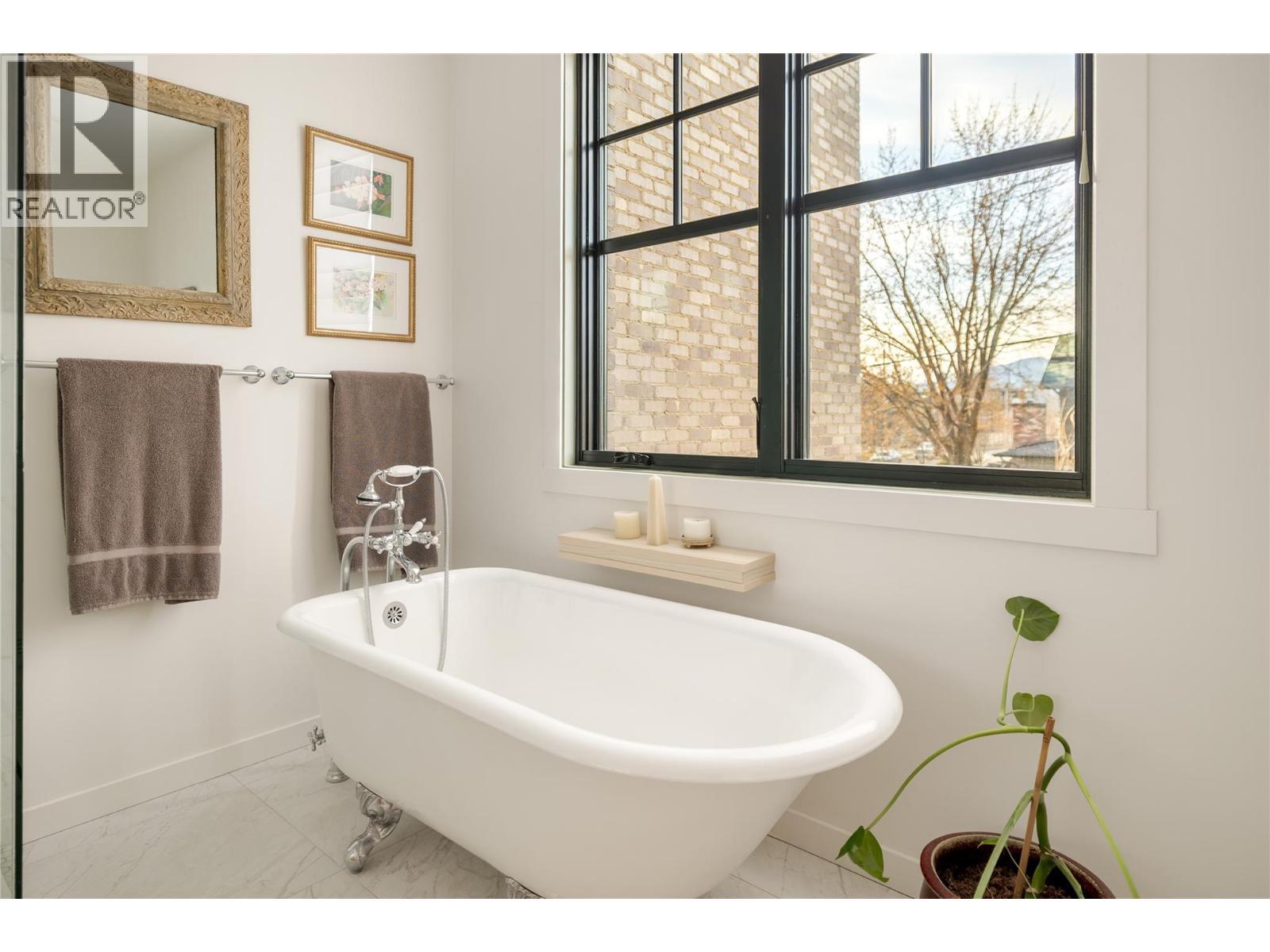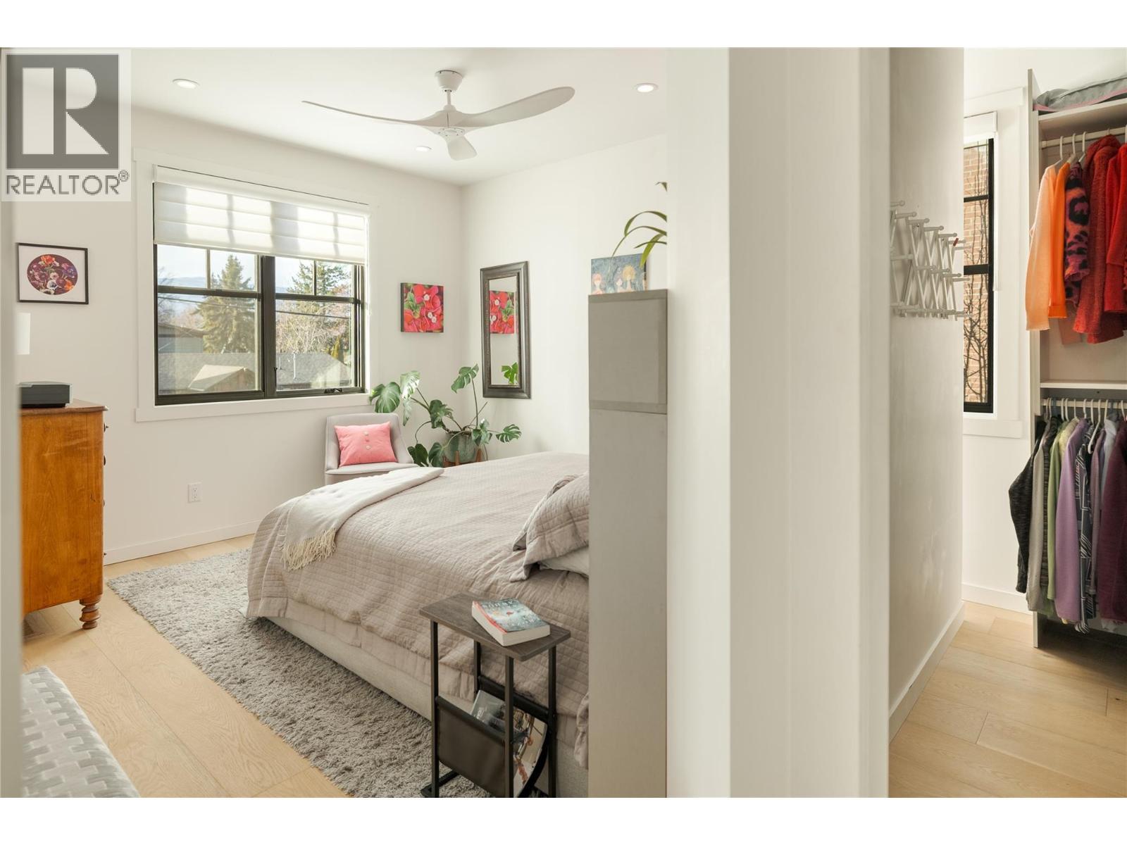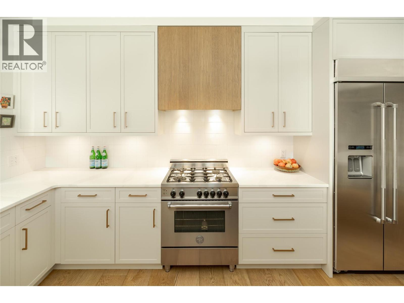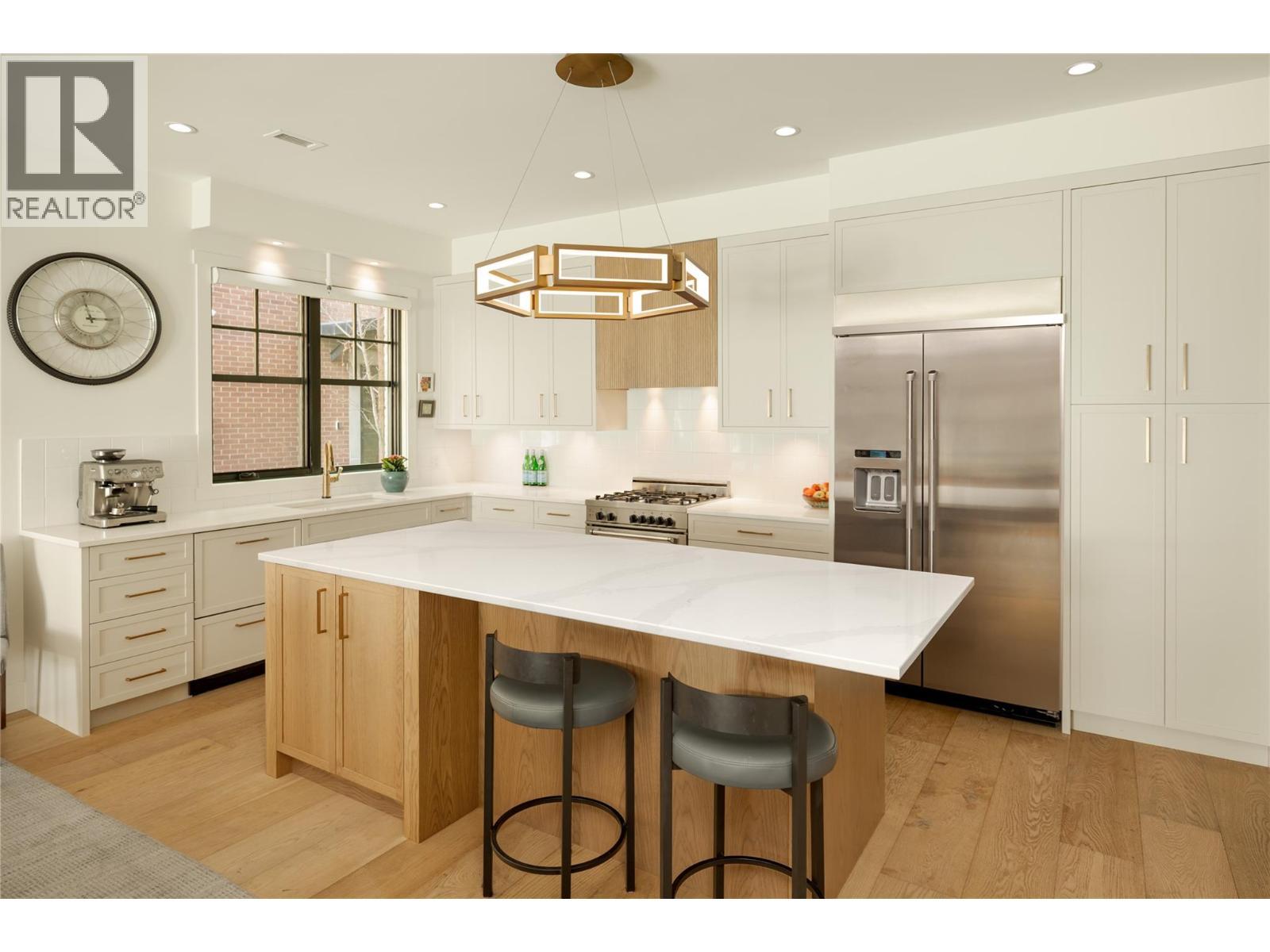 Life here unfolds effortlessly. Evening walks to the lake become routine, morning coffee from your favourite café is just down the street, and dinner reservations, boutiques, and daily essentials are all steps from home. Set in the heart of Pandosy Village, this is where urban energy meets relaxed Okanagan living. The timeless brick exterior offers warmth and character, while beyond the gate a private, fenced patio with a louvered pergola creates an inviting outdoor retreat—ideal for summer dinners, quiet mornings, or gathering with friends. Inside, wide plank wood flooring spans the main level, grounding the open-concept design with warmth and style. The living room is centred around a striking fireplace and custom built-ins, creating a polished yet comfortable space. Patio doors extend the living area outdoors with ease. The spacious dining area flows seamlessly into a beautifully appointed kitchen with a generous island, Bertazzoni gas range, Fisher & Paykel dual dishwasher, built-in wine fridge, custom hood fan, and two-tone cabinetry. Thoughtful storage is found throughout—from custom millwork and built-ins to well-designed cupboards and a rare private, oversized single garage with room for bikes, seasonal items, and everyday extras. A discreet powder room completes the main level. Upstairs, a versatile flex space is ideal for a home office, reading nook, or creative retreat. The primary suite offers mountain views & a spa-inspired ensuite with soaker tub, glass shower, dual vanity, and heated floors. The second bedroom features an integrated Murphy bed, while a full bathroom and laundry room complete the upper level. Stylish, low-maintenance living in one of Kelowna’s most walkable and sought-after neighbourhoods. (id:6769)