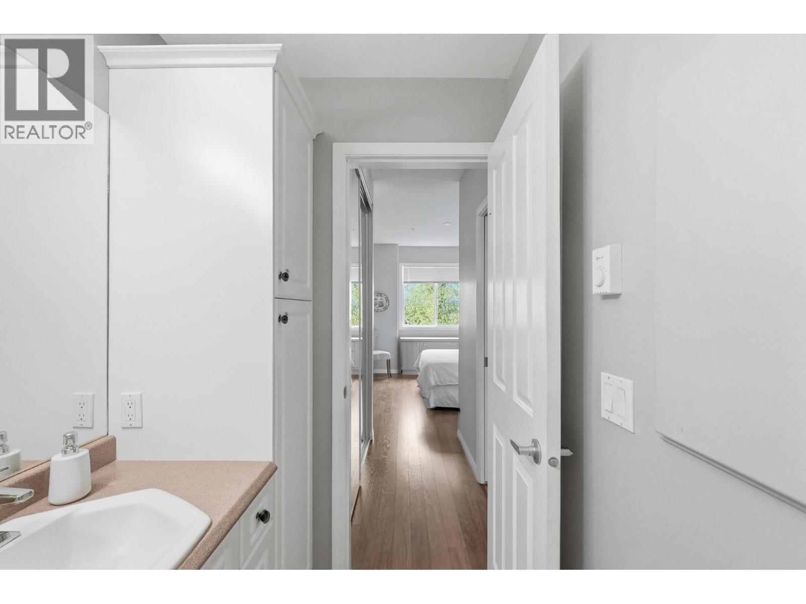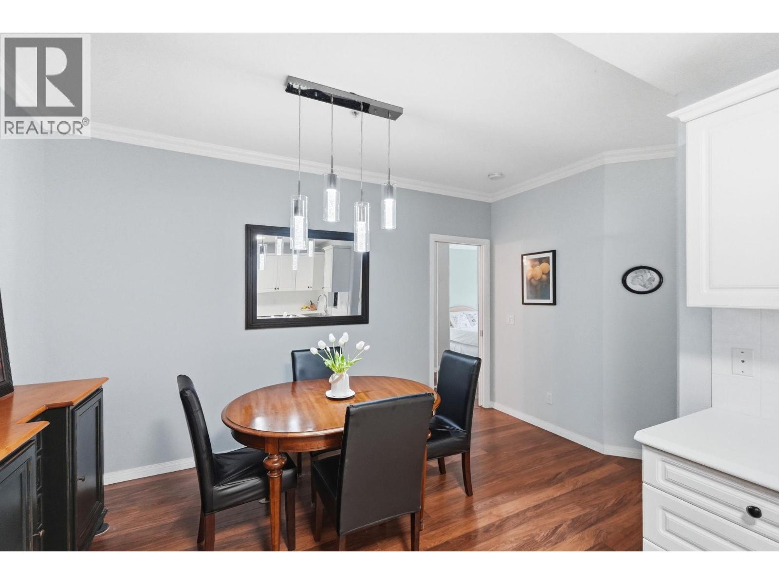 Welcome to this spacious 2-bedroom, 2-bathroom condo offering comfort, convenience, and a vibrant lifestyle. Perfectly suited for those seeking easy, low-maintenance living in a well-managed and friendly community. Meadowbrook Estates features beautifully landscaped grounds and a great social atmosphere with excellent amenities. The kitchen features crisp white cabinetry, a newer dishwasher, and updated plumbing fixtures, with a convenient pass-through to the living room that enhances both light and functionality. Laminate flooring flows throughout the main living areas, complemented by 9 ft ceilings, crown moldings, an updated fireplace façade, and a newer chandelier for a polished feel. The well-designed split-bedroom layout provides privacy, while the covered balcony overlooks a peaceful treed creek. Additional comforts include air conditioning and in-suite laundry. Residents enjoy access to an outdoor pool, clubhouse, exercise room, and guest suite. Pet-friendly with restrictions, this home is ideal for downsizers, professionals, or first-time buyers. Conveniently located within walking distance to shops, restaurants, medical services, and transit. Includes 1 secure underground parking stall and 1 storage locker. THIS ONE IS AVAILABLE AND EASY TO SHOW! (id:6769)
